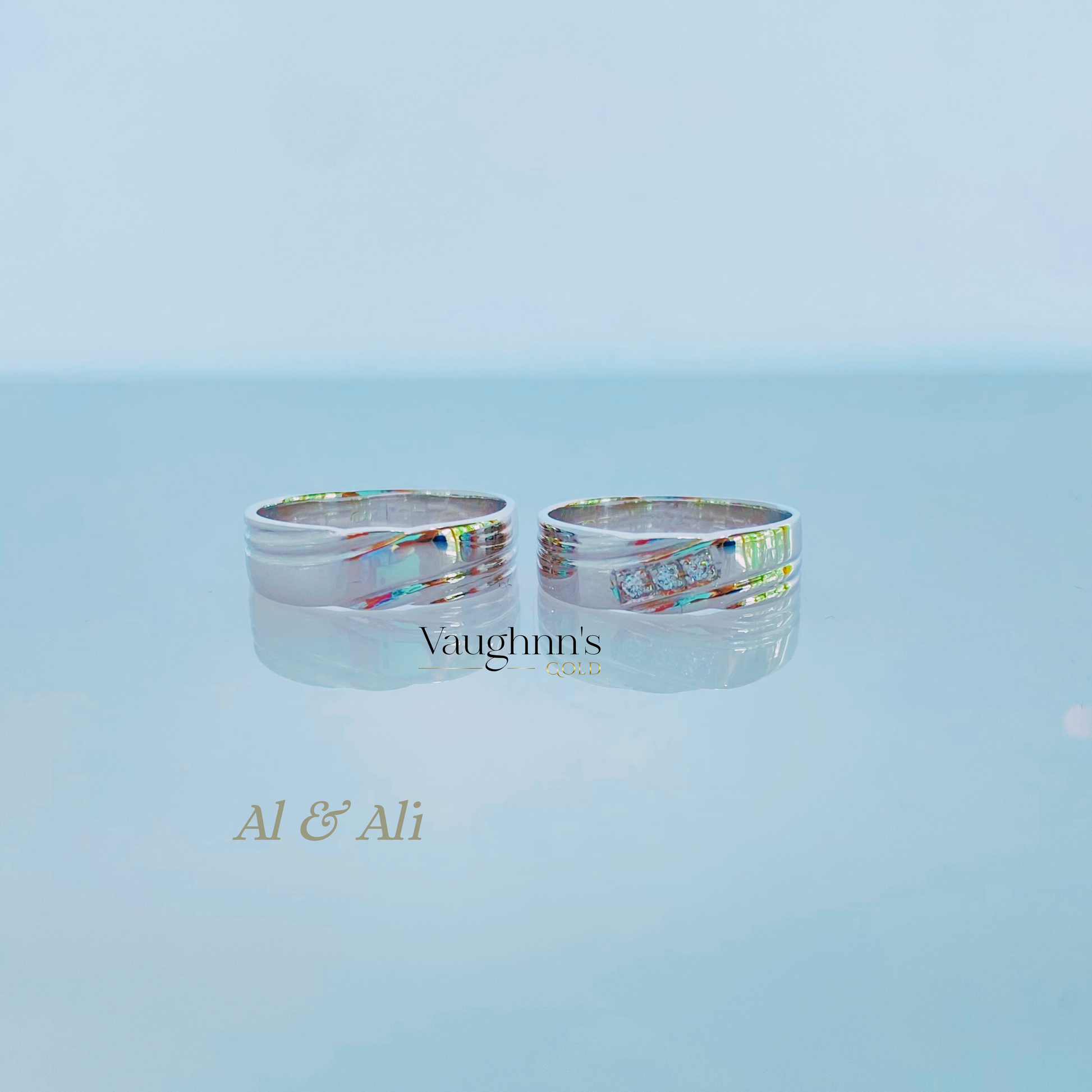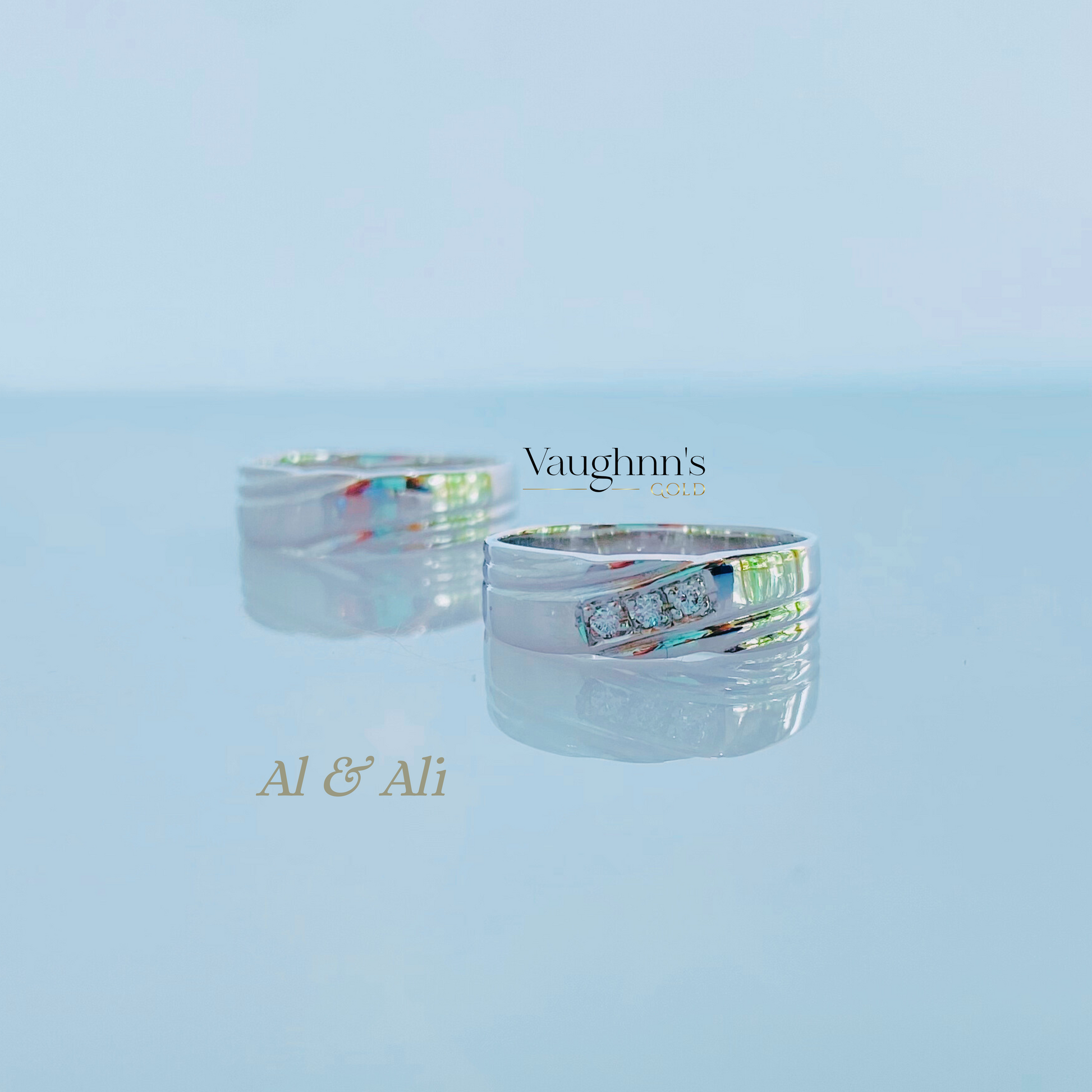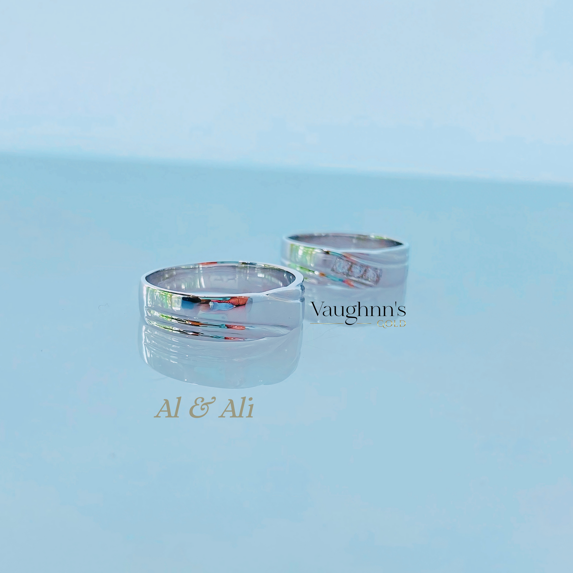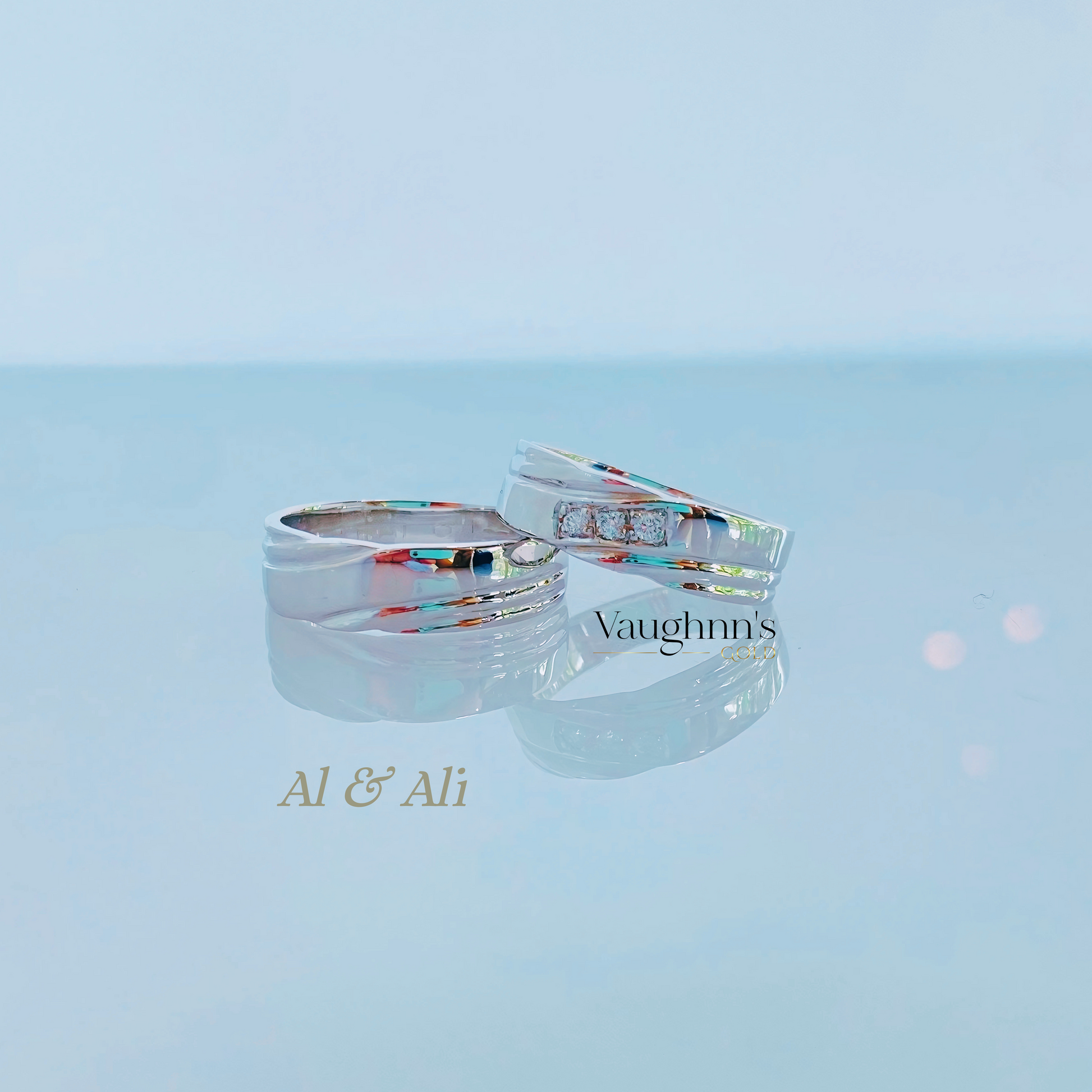 Crafted in 18k solid white gold, their rings feature a modern line design that reflects their distinct personalities.