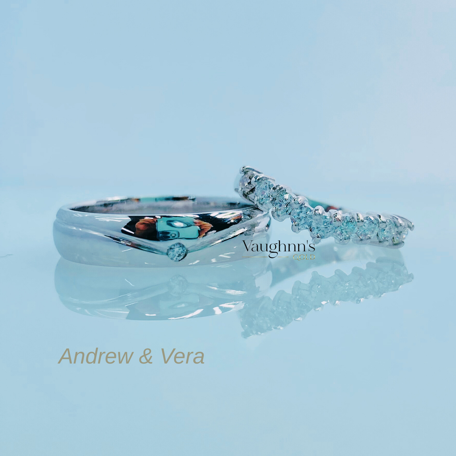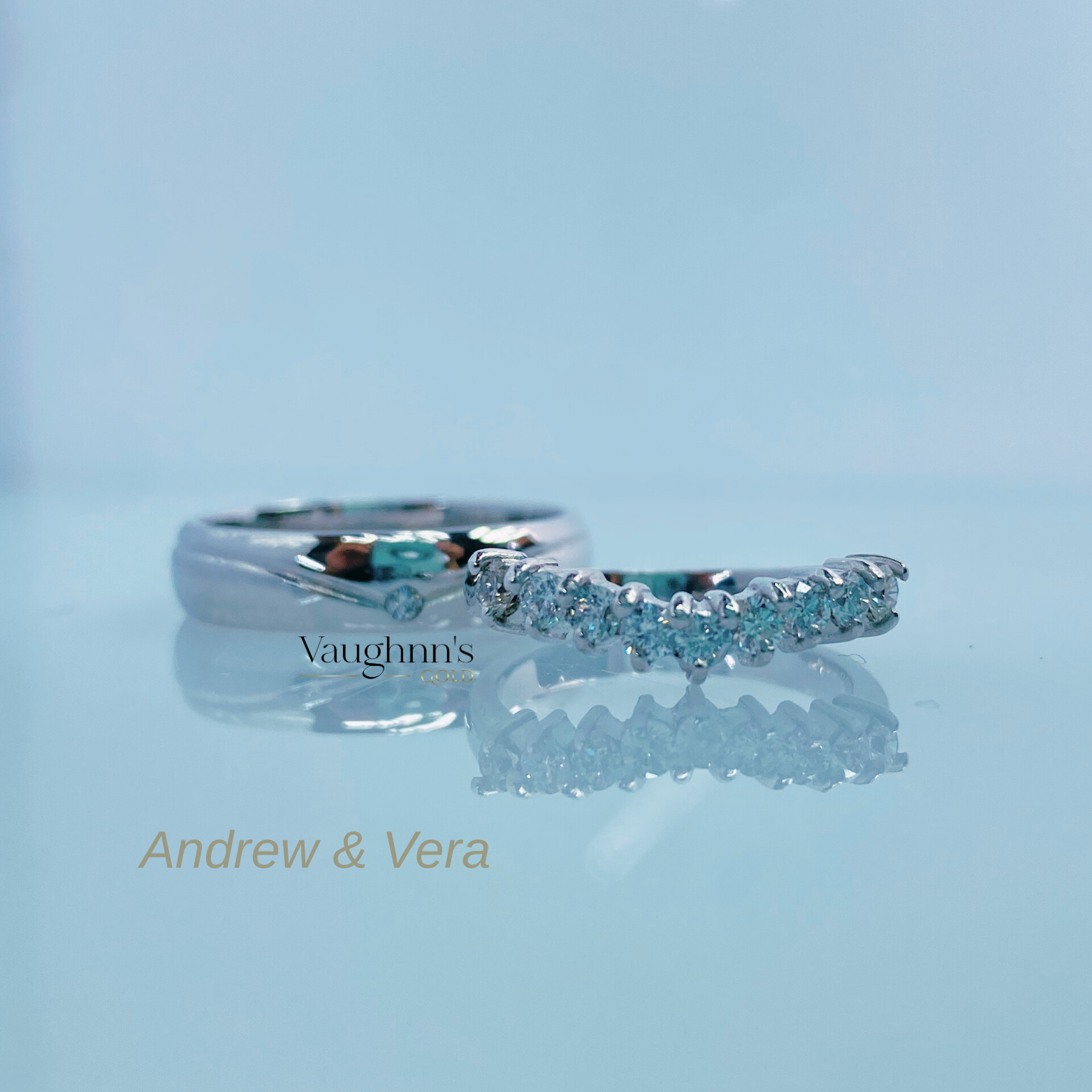 Experience the dazzling allure of Andrew and Vera, a unique couple that captures your own personal story. Andrew's band features a white gold base with a stunning stone accent, complemented by Vera's 0.05ct moissanite or diamond half-eternity band in 18k solid white gold. Discover the enchanting brilliance of Andrew and Vera for yourself.