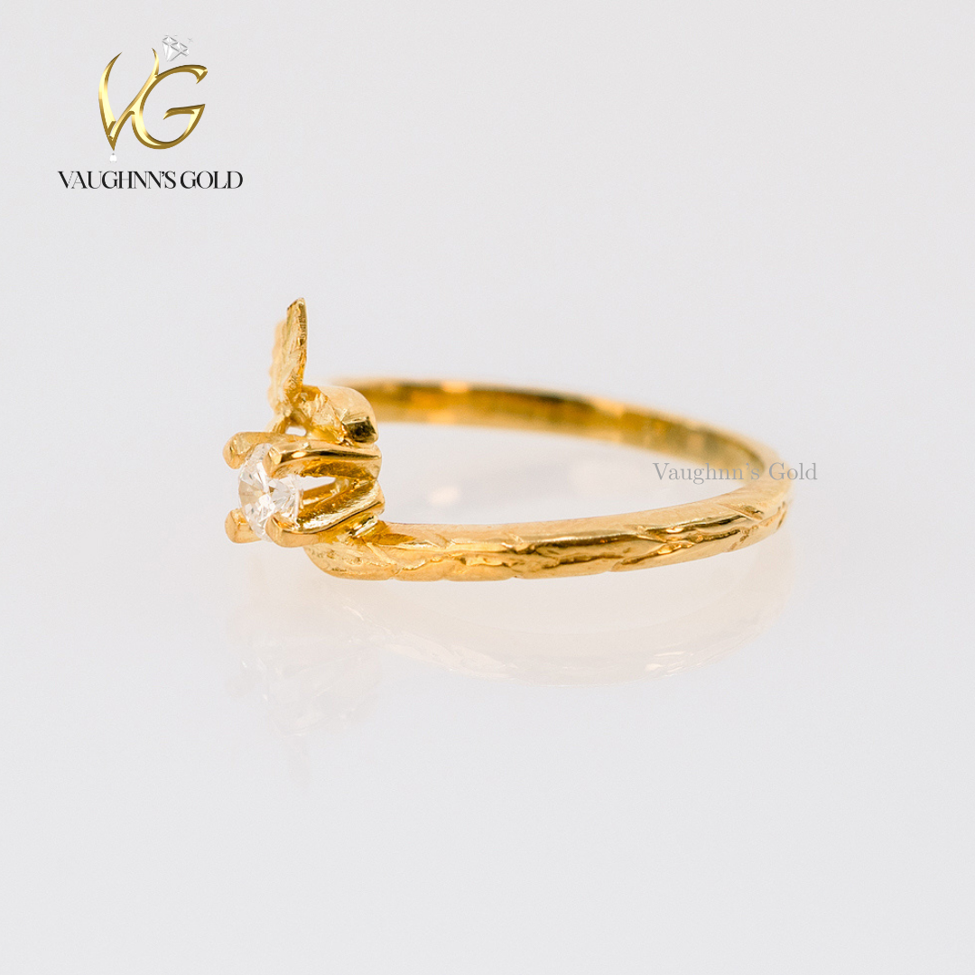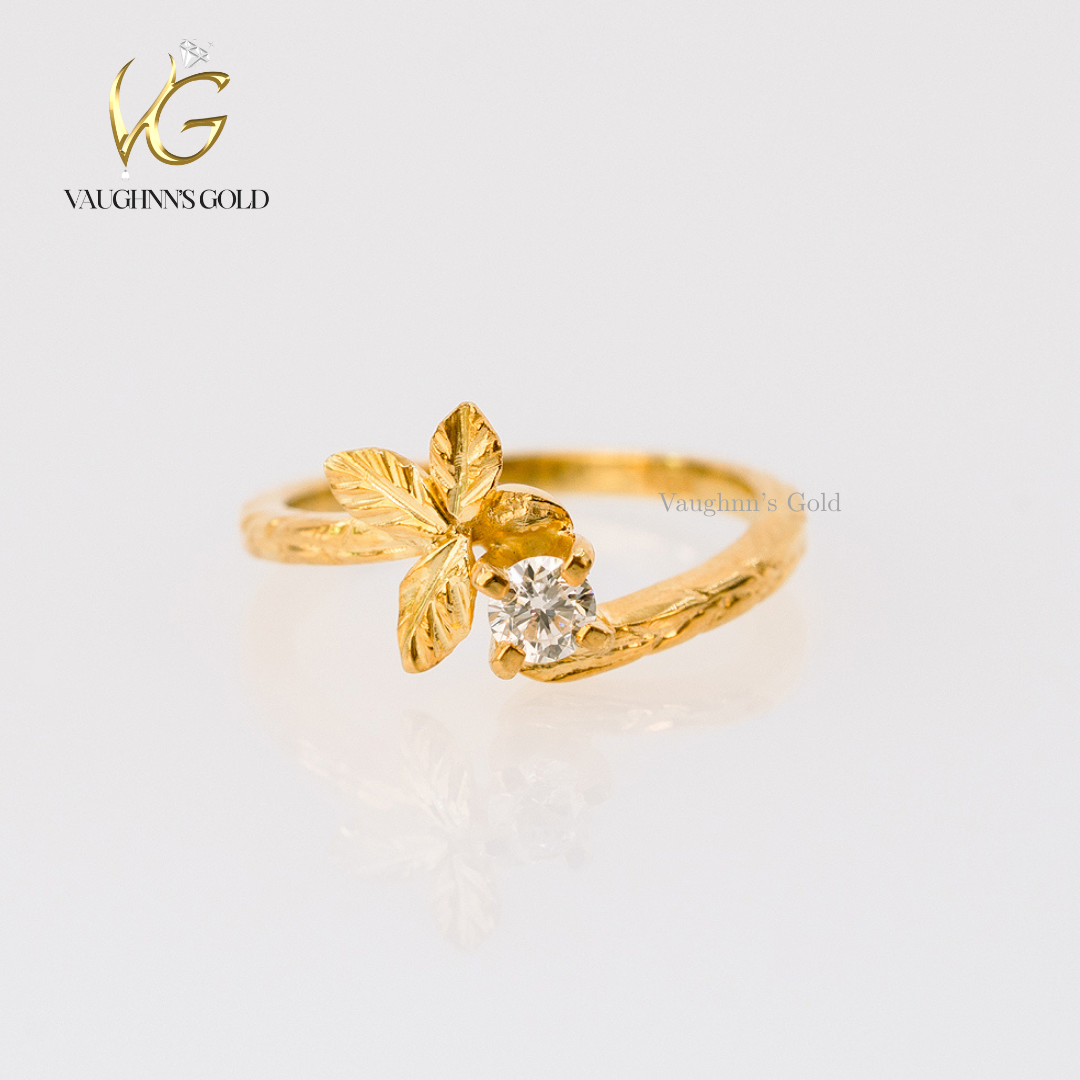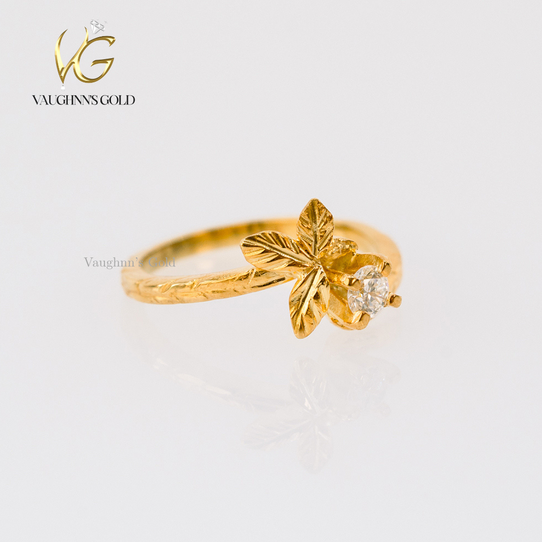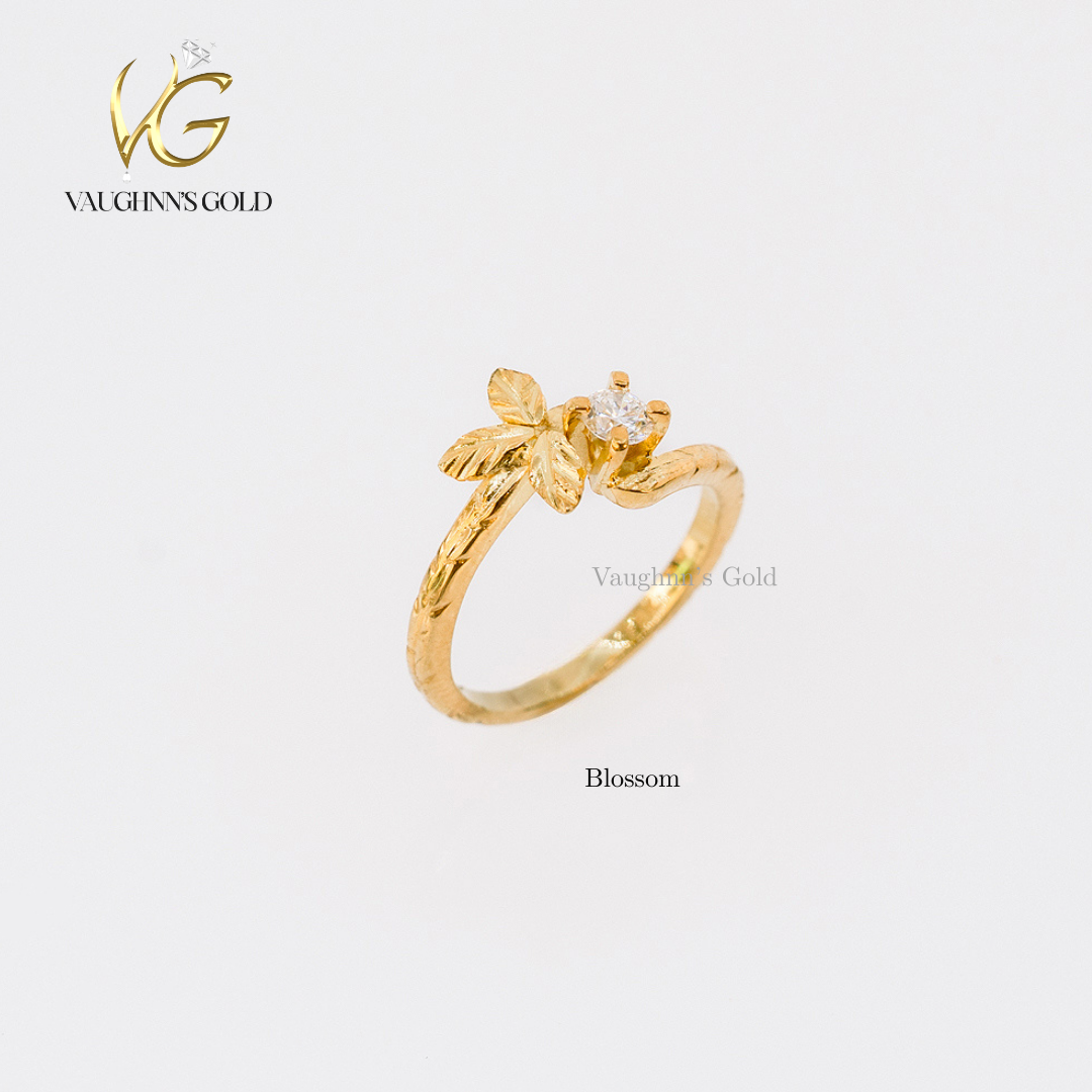 The Blossom engagement ring is crafted in solid yellow gold, featuring a radiant 0.50 ct moissanite center stone held in a graceful floral-inspired setting. Delicate leaf details wrap around the band, creating a nature-inspired design that feels romantic, fresh, and timeless.