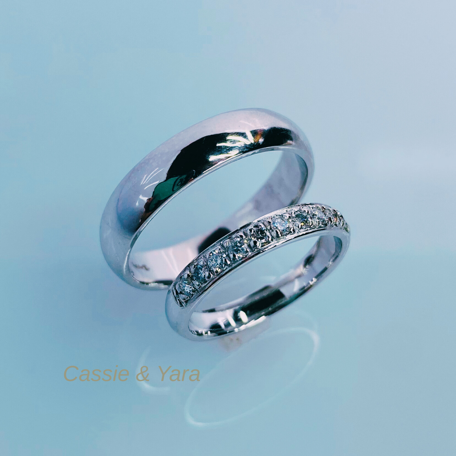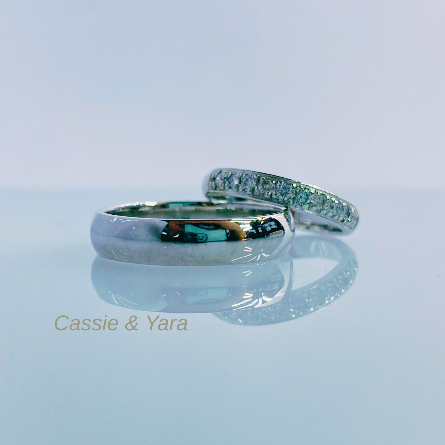Bring your own story to life with high-quality, elegant jewelry. The mesmerizing duo of Cassie & Yara showcase elegant 18k white gold half-eternity bands complete with 0.05ct moissanite or diamond detailing.