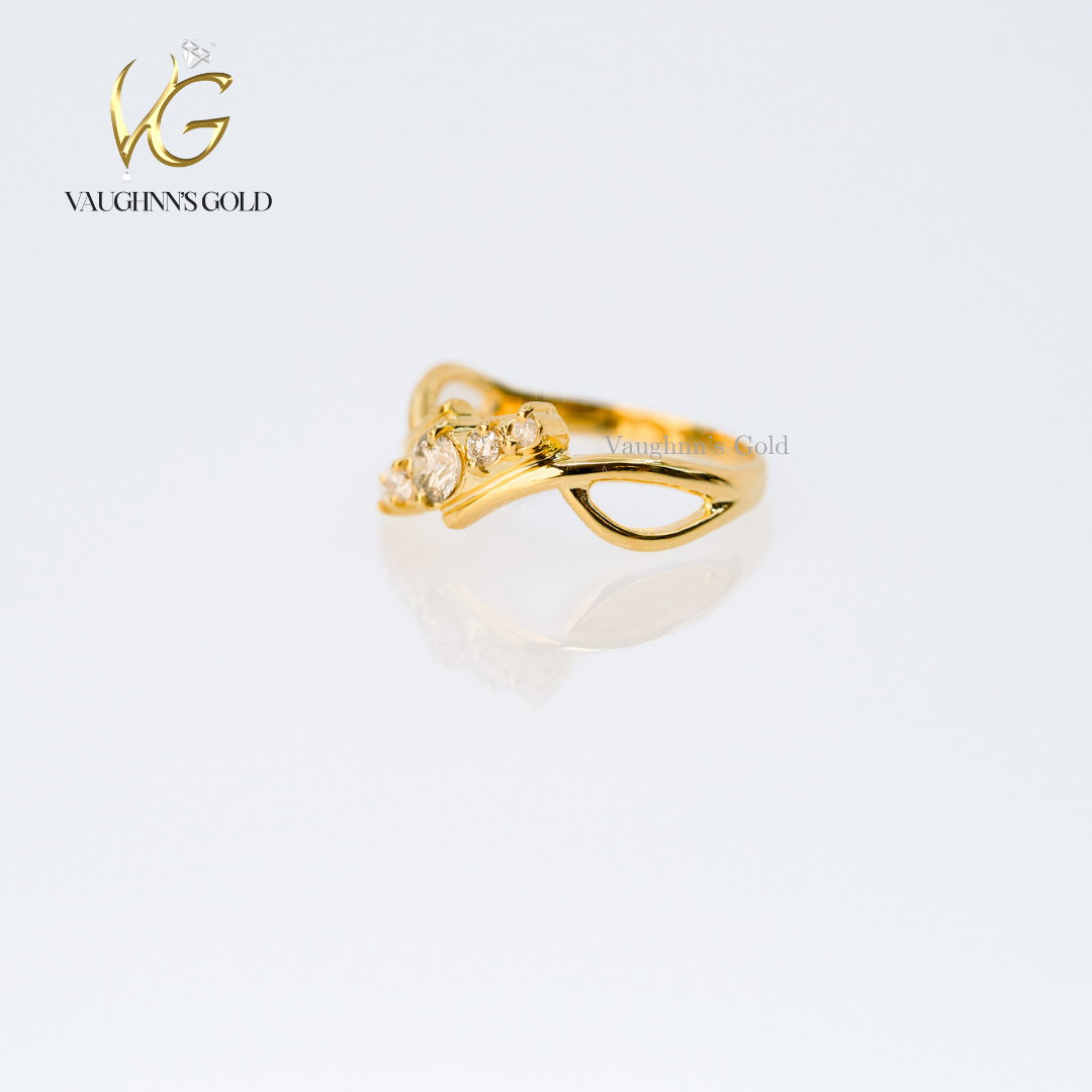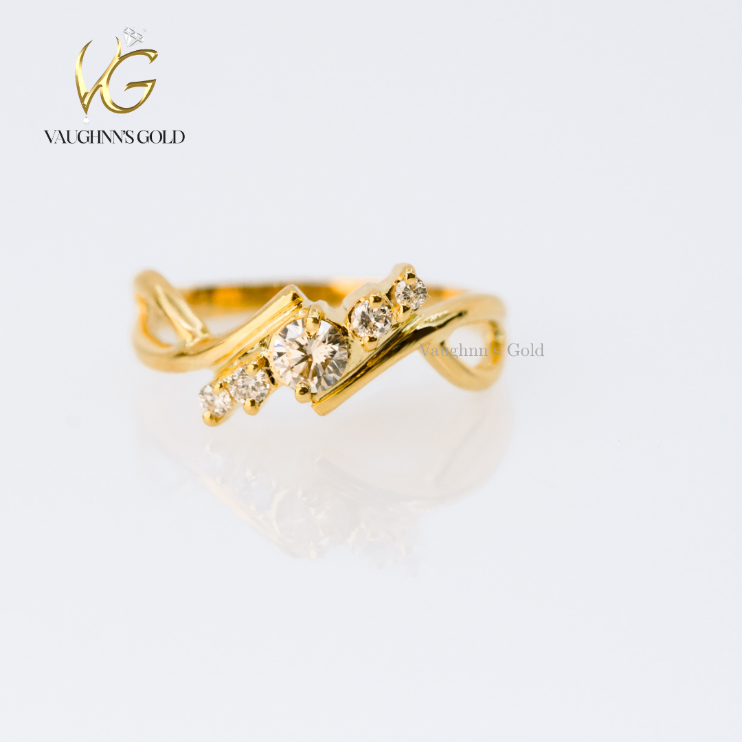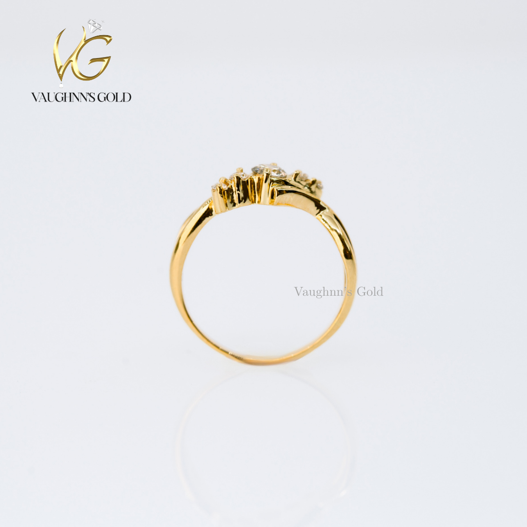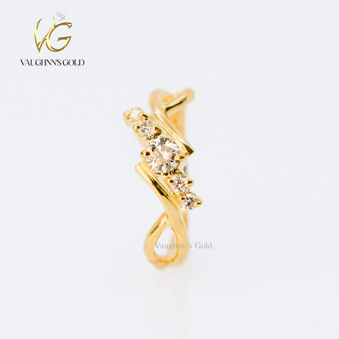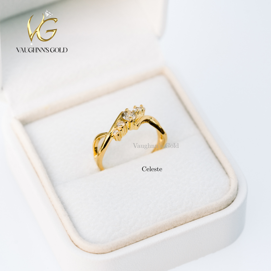The Celeste engagement ring is crafted in solid yellow gold, featuring a brilliant 0.20 ct diamond center stone embraced by shimmering side stones for added radiance. Its graceful, flowing band curves elegantly around the center, creating a soft, modern silhouette that catches the light from every angle.