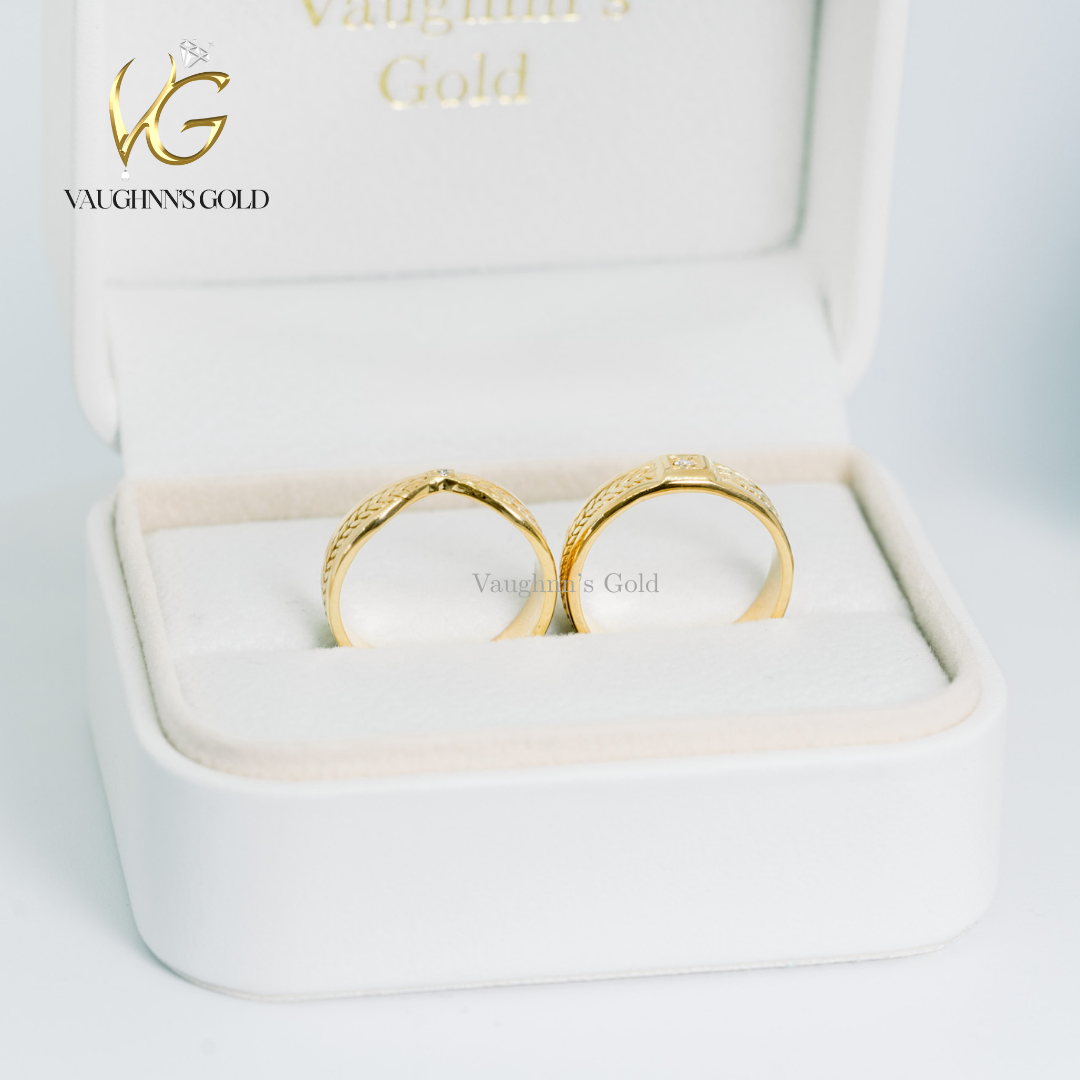 A timeless symbol of unity, this exquisite wedding ring set features an elegant V-cut design crafted in lustrous solid yellow gold. The intricate braided detailing adds depth and character, while the center stone catches light beautifully. Perfect for couples seeking a refined, distinctive piece that celebrates their commitment with understated elegance and enduring quality.