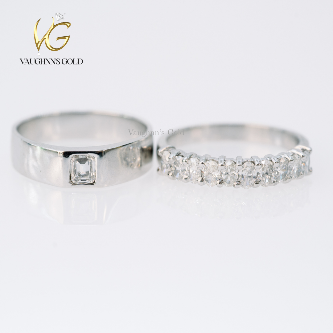 - Gemstone Size: 1 ct (Asscher/Groom) and 0.10 (Oval/Bride)
