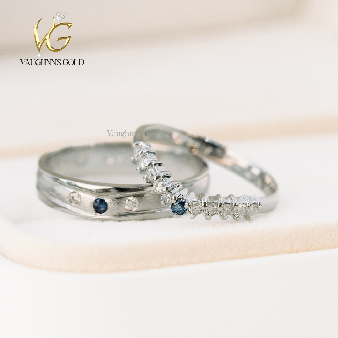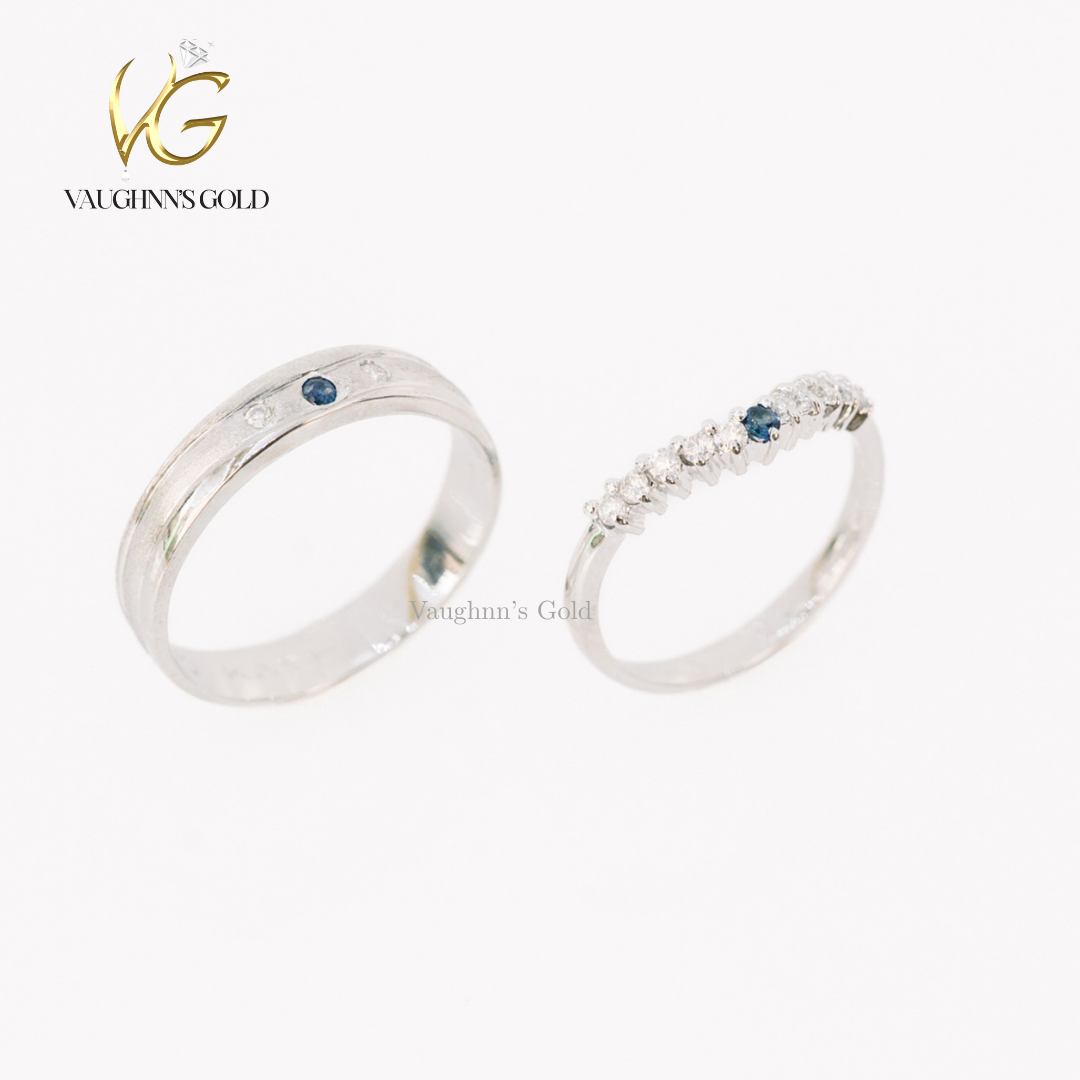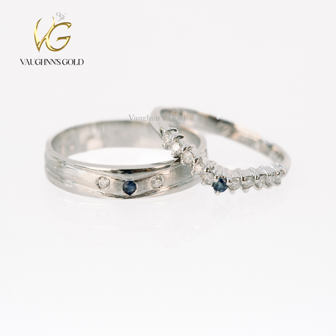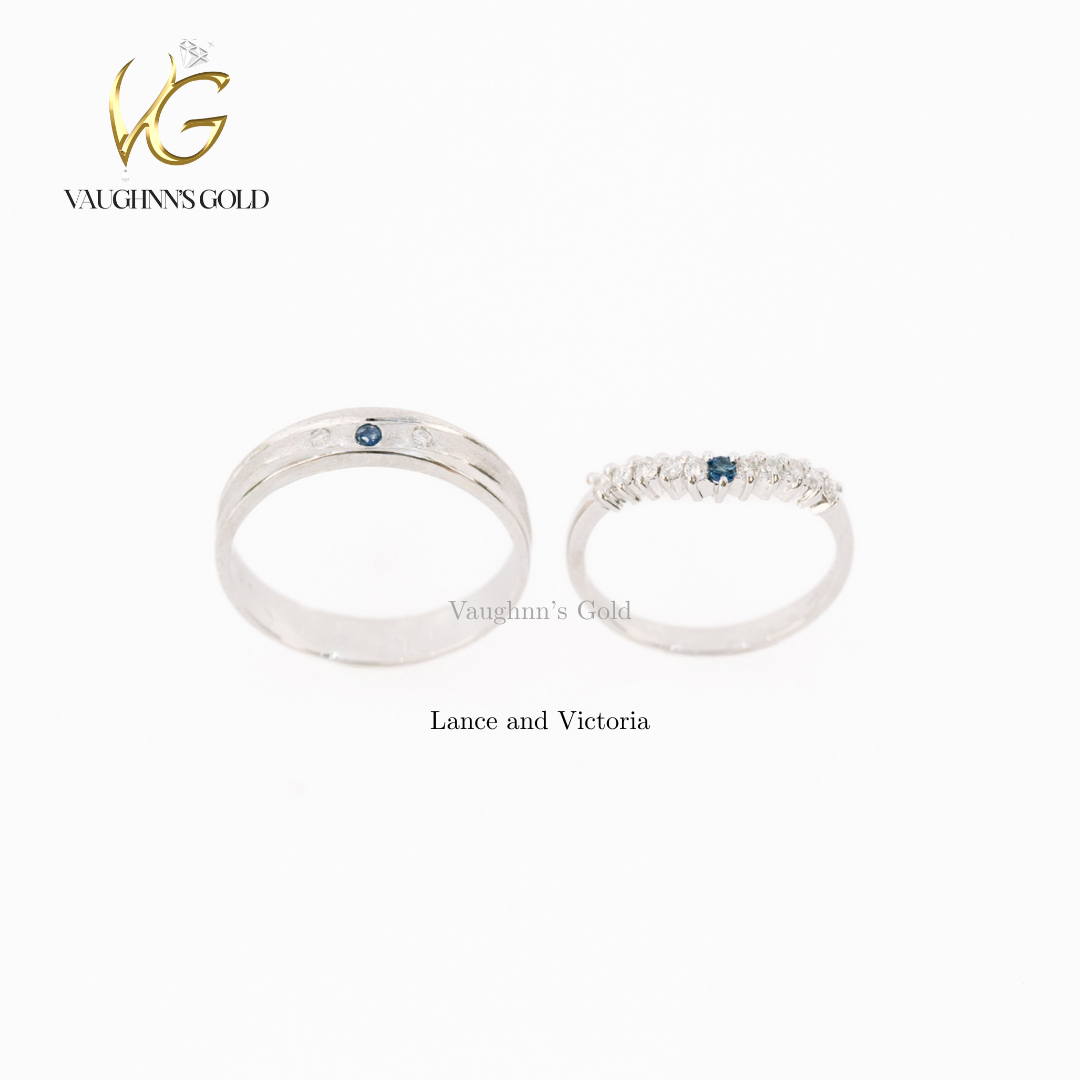 The Lance and Victoria wedding ring collection features matching solid white gold bands designed for the modern couple. The groom's ring showcases a striking 0.02ct blue sapphire center stone, while the bride's ring combines a 0.02ct blue sapphire center with accent diamonds and an elegant v-cut design. This coordinated pair celebrates unity and individuality, with each ring crafted to complement the other.