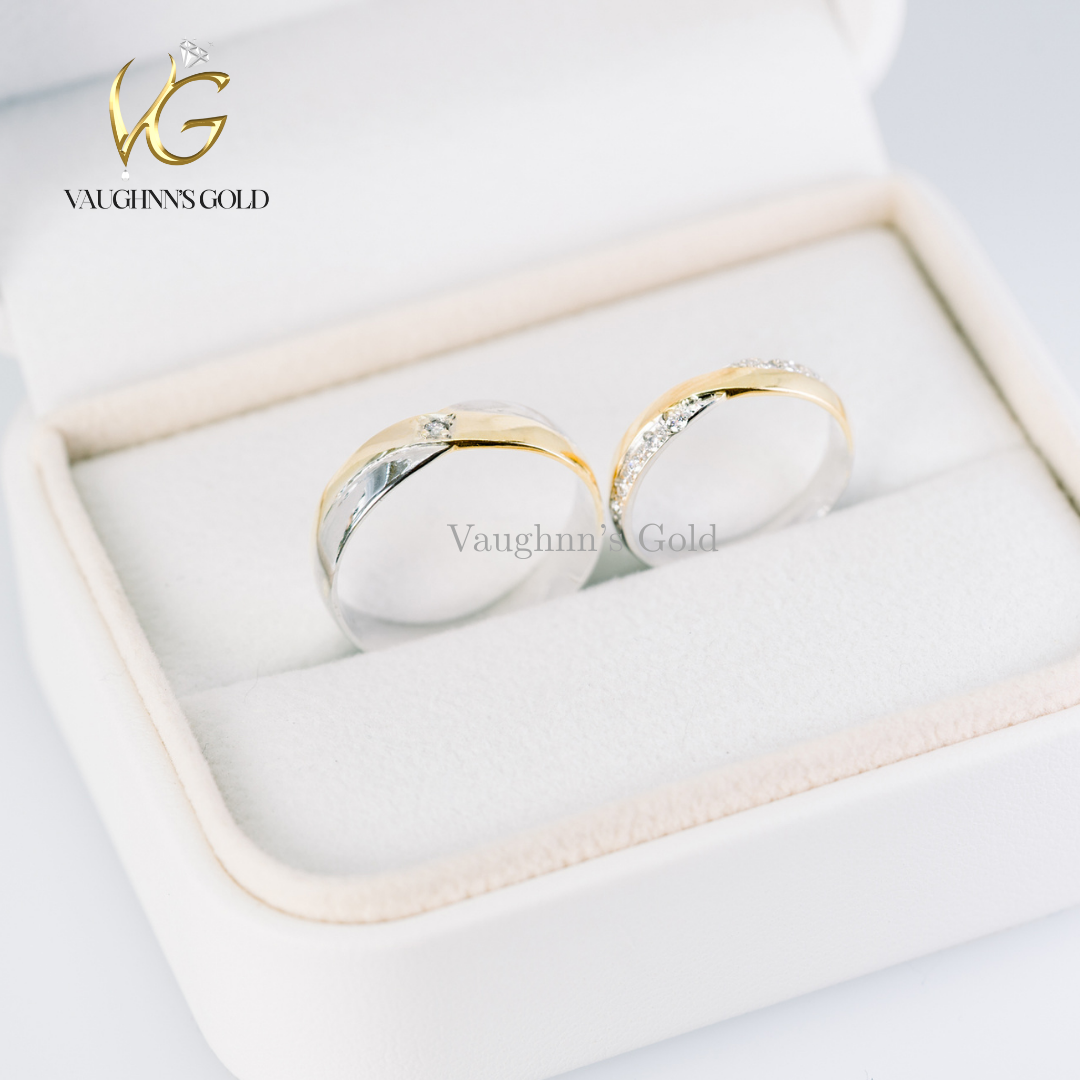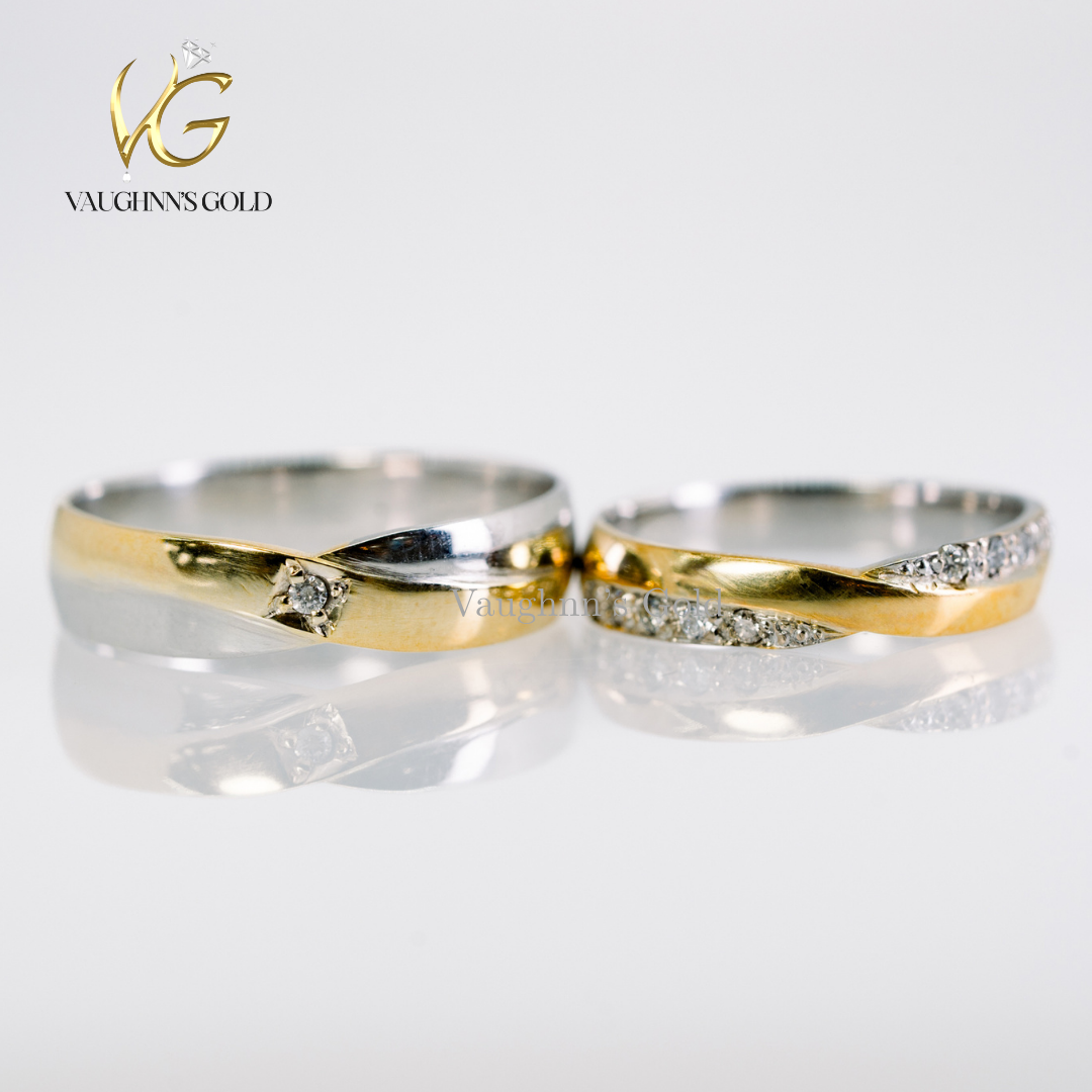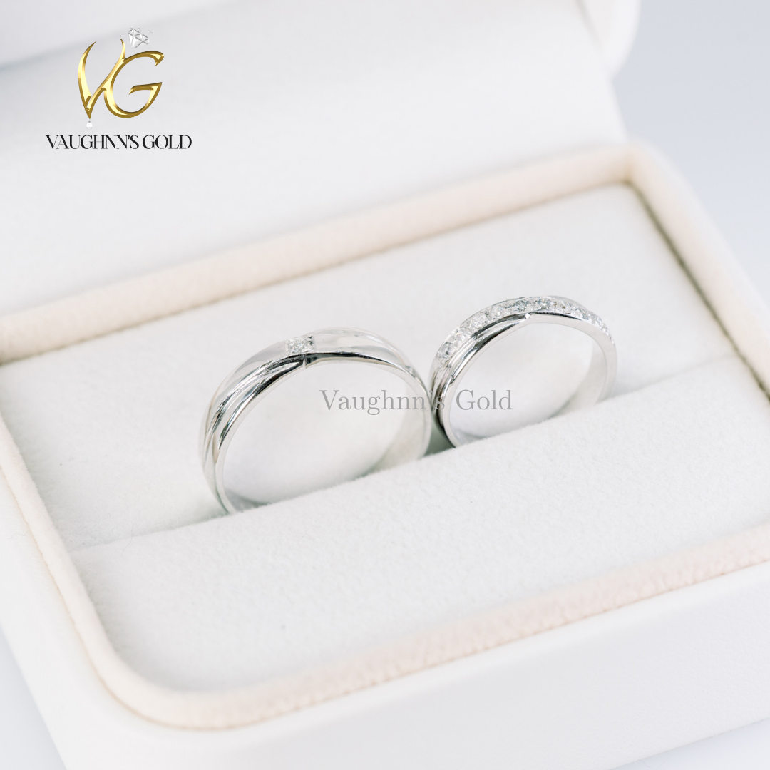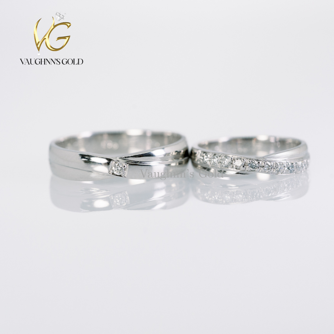 The groom’s band features a sleek polished finish with a subtle single diamond accent for a refined, masculine touch. The bride’s ring shines with a graceful row of sparkling stones set along a curved band, designed to complement and embrace the partner ring perfectly.