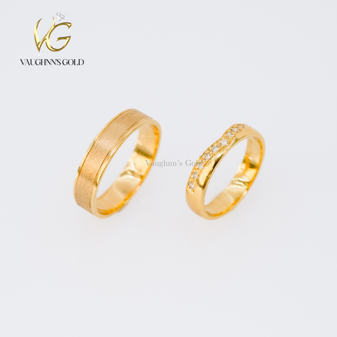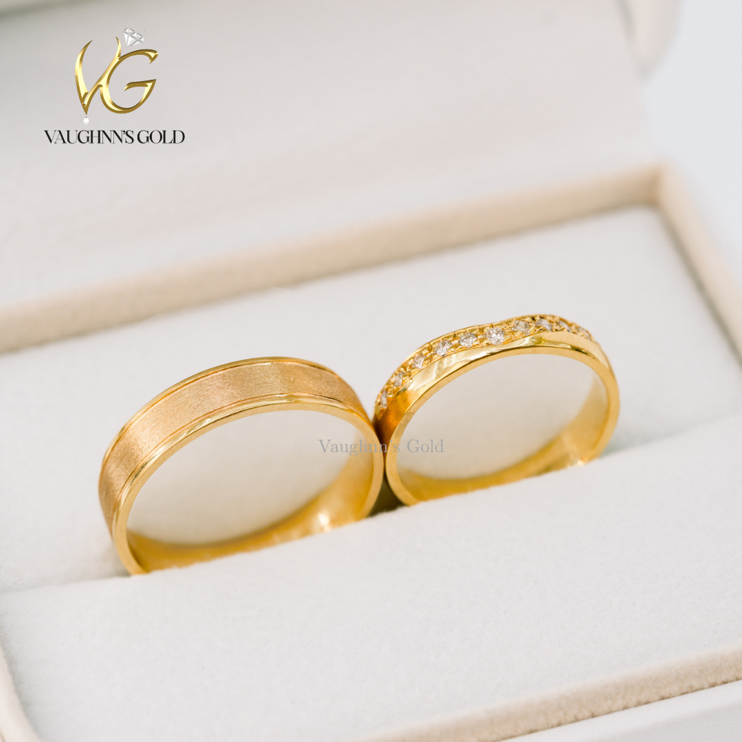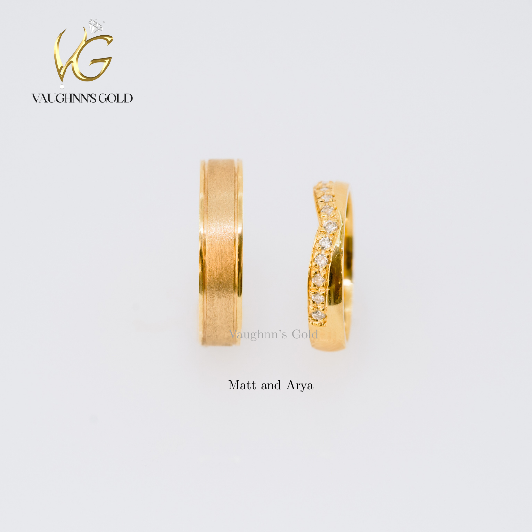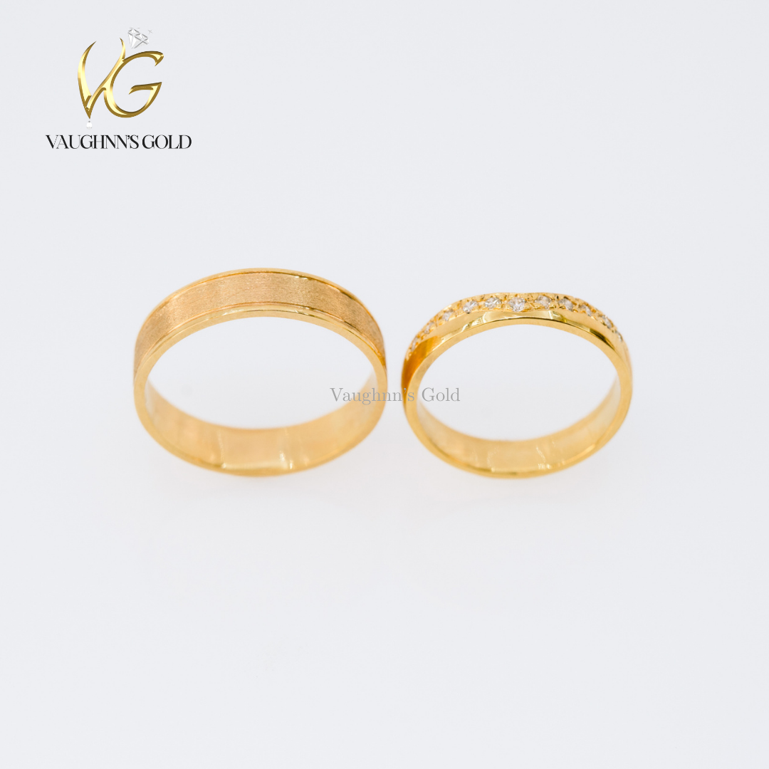 A stunning matching pair crafted in solid yellow gold. The bride's ring features an elegant V-cut band that catches the light beautifully, while the groom's band showcases a sophisticated sandblasted matte finish for a modern, understated look. Together, they create a harmonious blend of brilliance and texture, perfect for couples who appreciate both elegance and individuality in their wedding bands.
