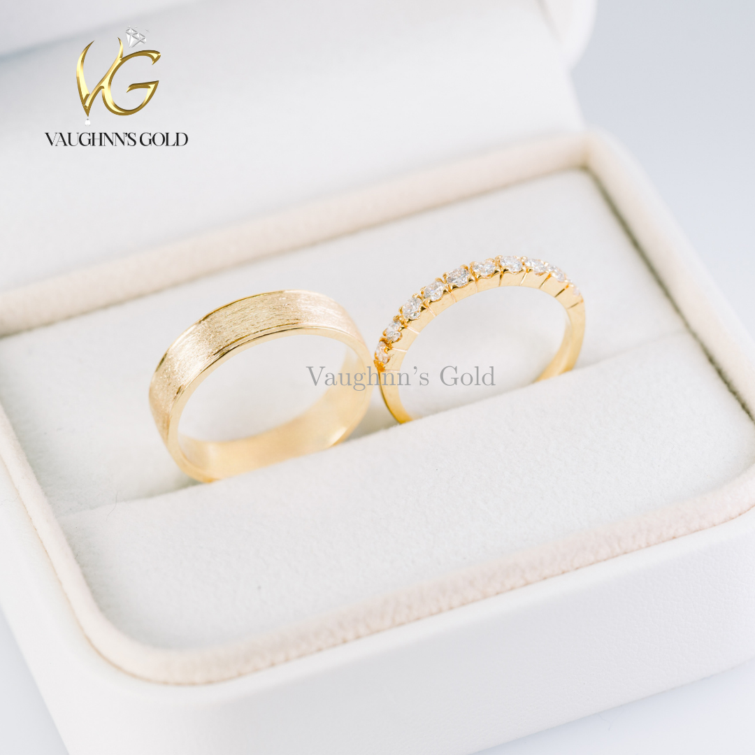 Celebrate your union with the Matt and Helena wedding ring set, a timeless symbol of enduring love. The bride's ring features lustrous solid yellow gold adorned with sparkling 0.03ct diamonds, while the groom's ring showcases the pure elegance of polished 18K yellow gold. Each piece is meticulously crafted to complement the other, creating a harmonious pair that reflects your unique bond and commitment to one another.