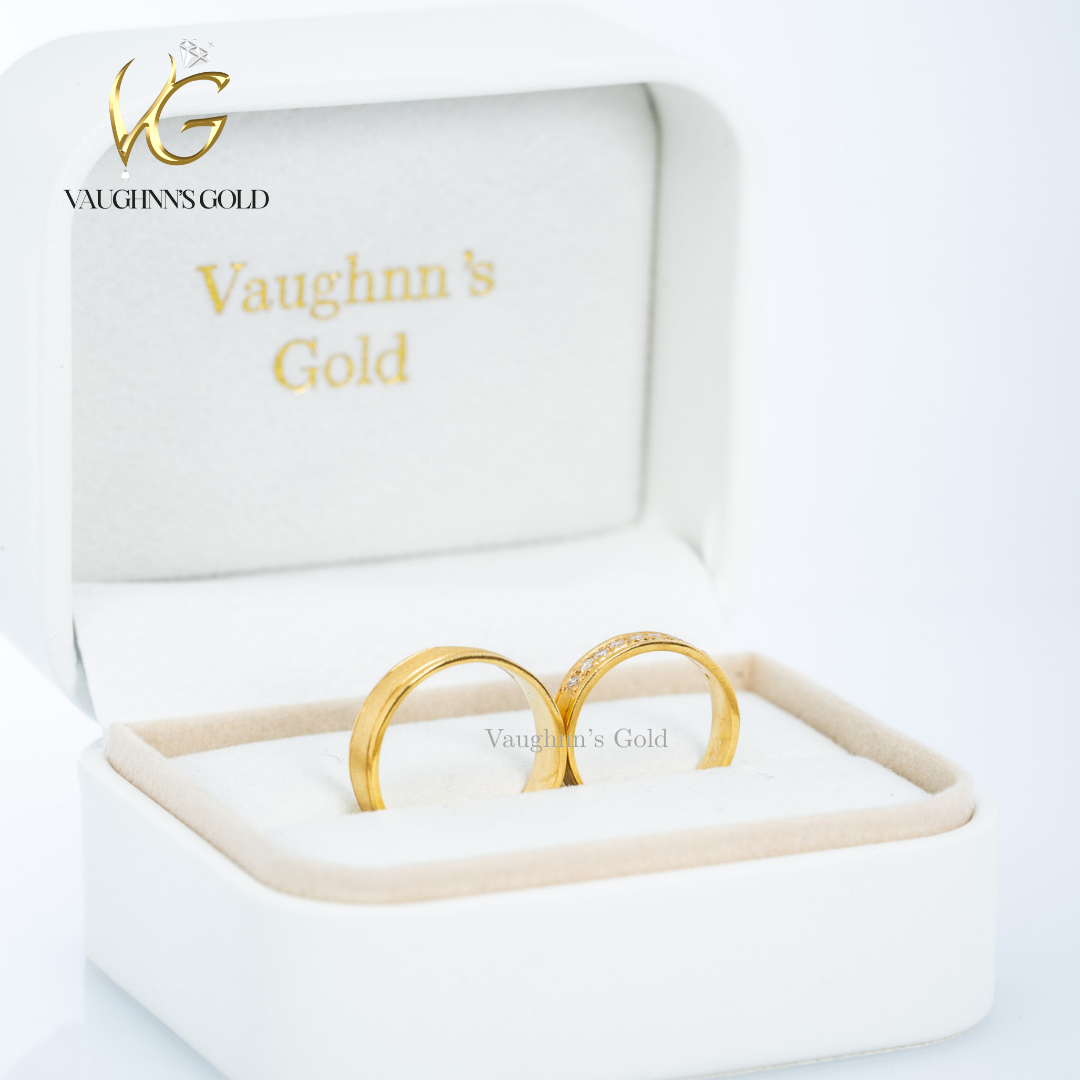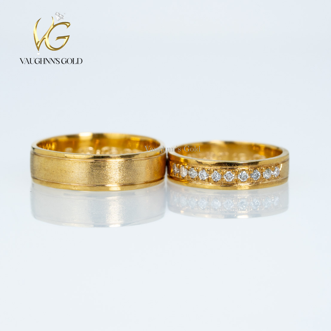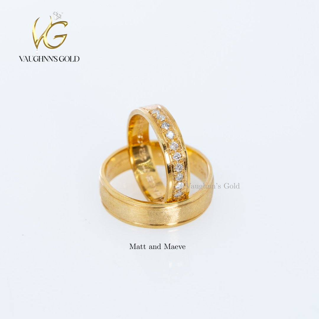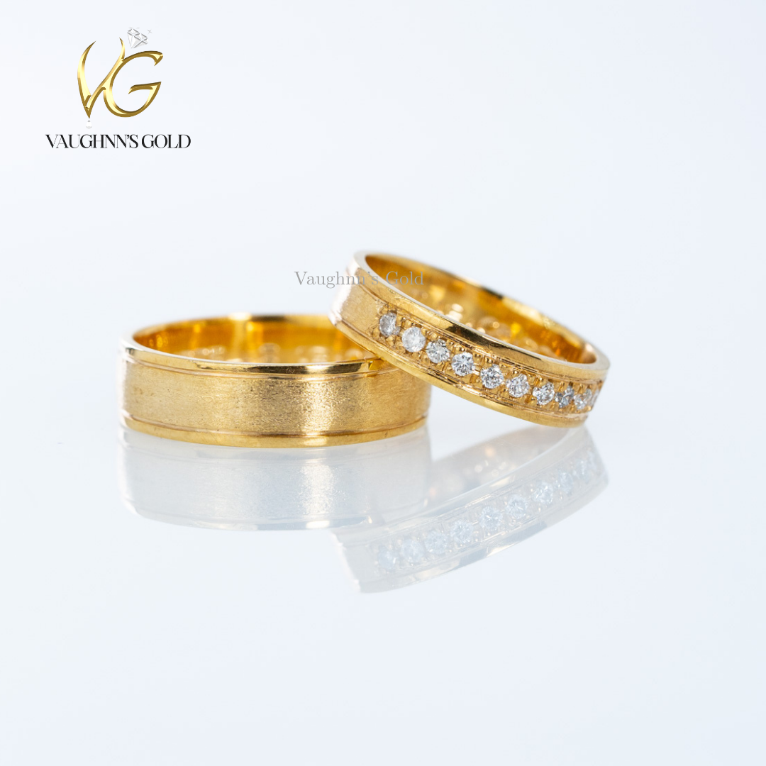 Matt and Maeve wedding bands feature solid yellow gold craftsmanship with distinctive texturing. The groom's band showcases a sandblasted finish for a modern, matte appearance, while the bride's band combines half-blasted texture with sparkling diamonds for elegant contrast. This complementary pair celebrates your union with refined design and lasting quality, perfect for couples seeking sophisticated matching rings with individual character.