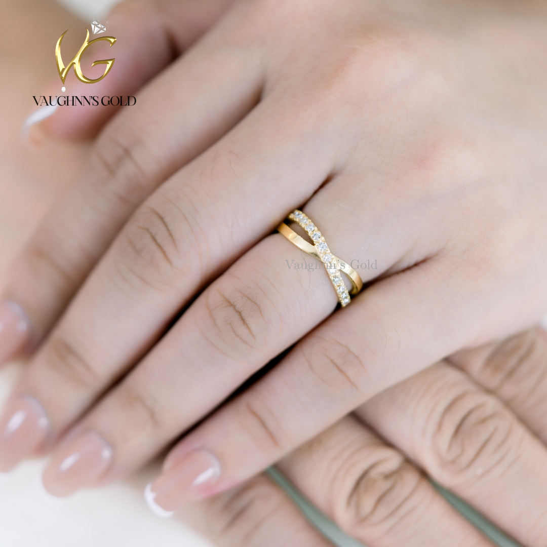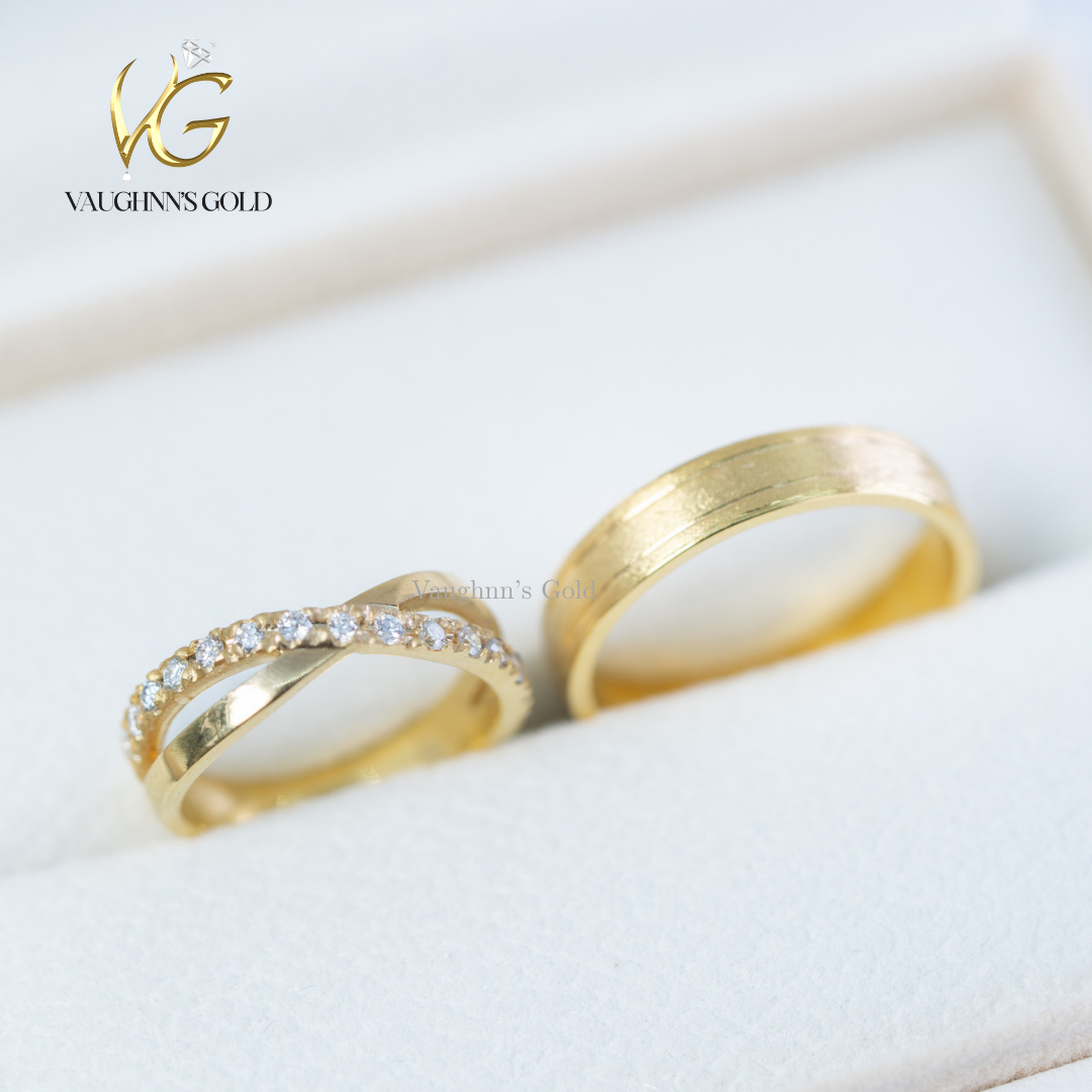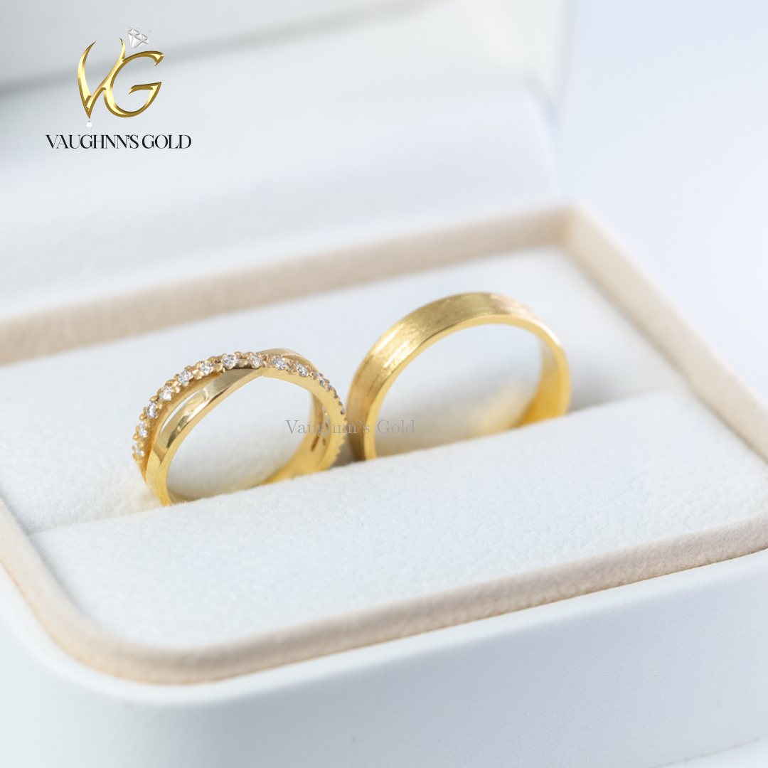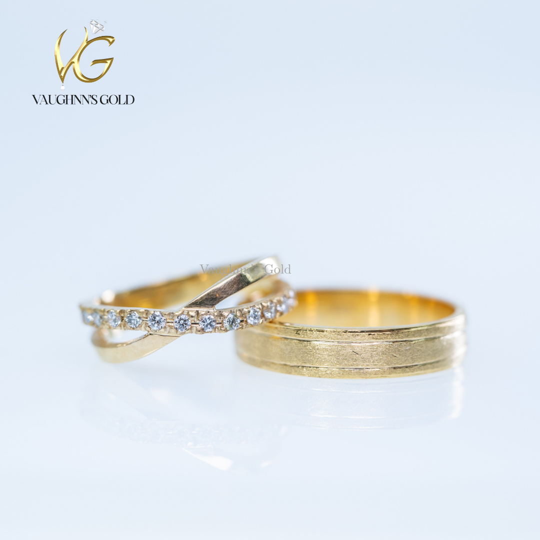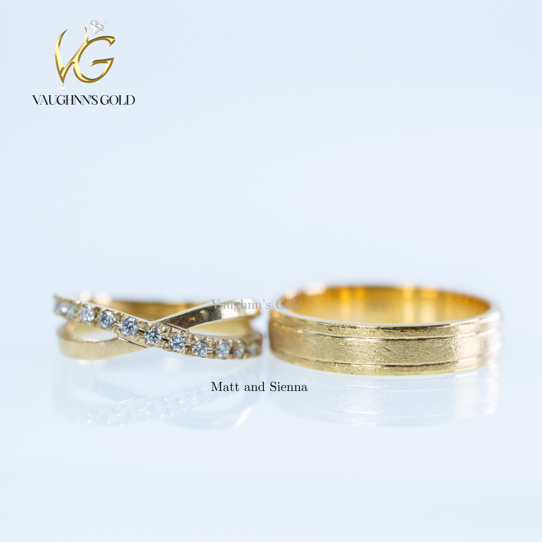 Matt and Sienna wedding rings feature elegant solid yellow gold construction with a distinctive crisscross band design. Each ring is adorned with sparkling diamonds that catch the light beautifully, creating a timeless symbol of commitment. The crossover pattern adds modern sophistication while maintaining classic appeal, making these rings perfect for couples seeking both style and substance in their wedding jewelry.