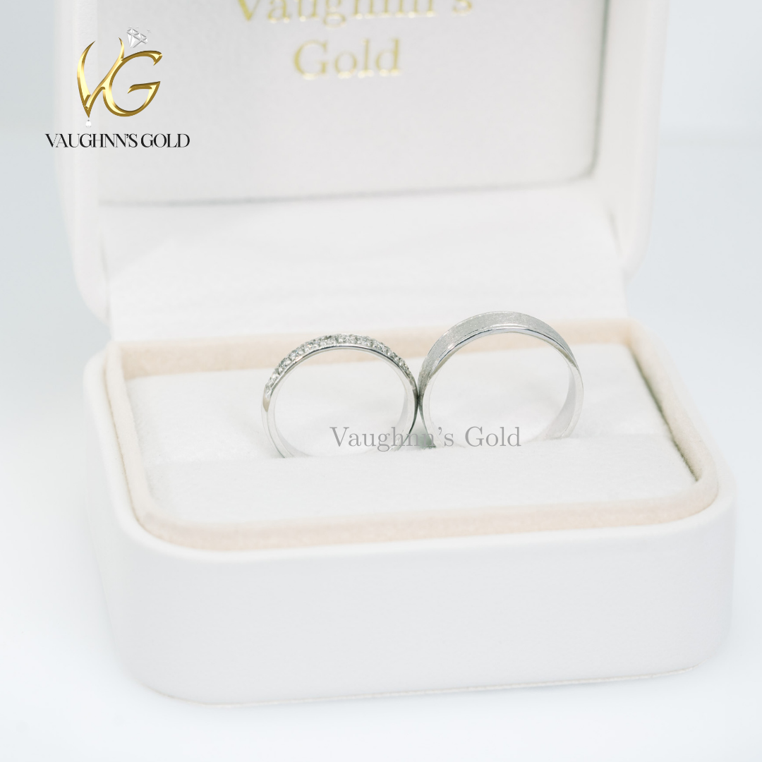 Celebrate your union with this refined wedding ring collection crafted in lustrous solid white gold. The bride's band sparkles with a graceful 0.03ct diamond, while the groom's polished band complements with understated elegance. A harmonious pairing that captures the essence of lasting devotion and timeless sophistication.