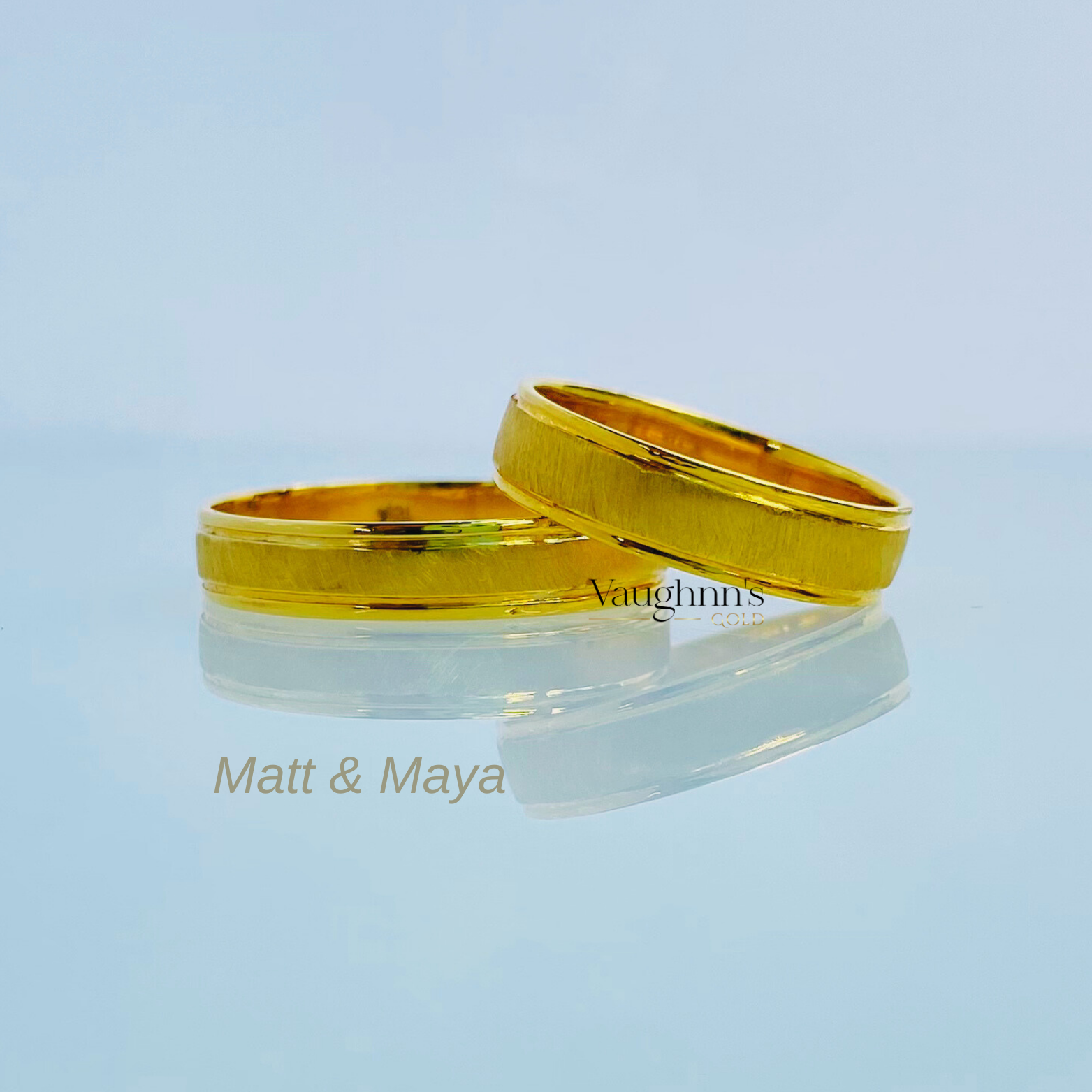 Matt & Maya's wedding band set exudes a sense of timeless sophistication and enduring charm with its classic sandblasted texture in 18k yellow gold. Customers adore the beloved and uncomplicated design, making it a top seller.