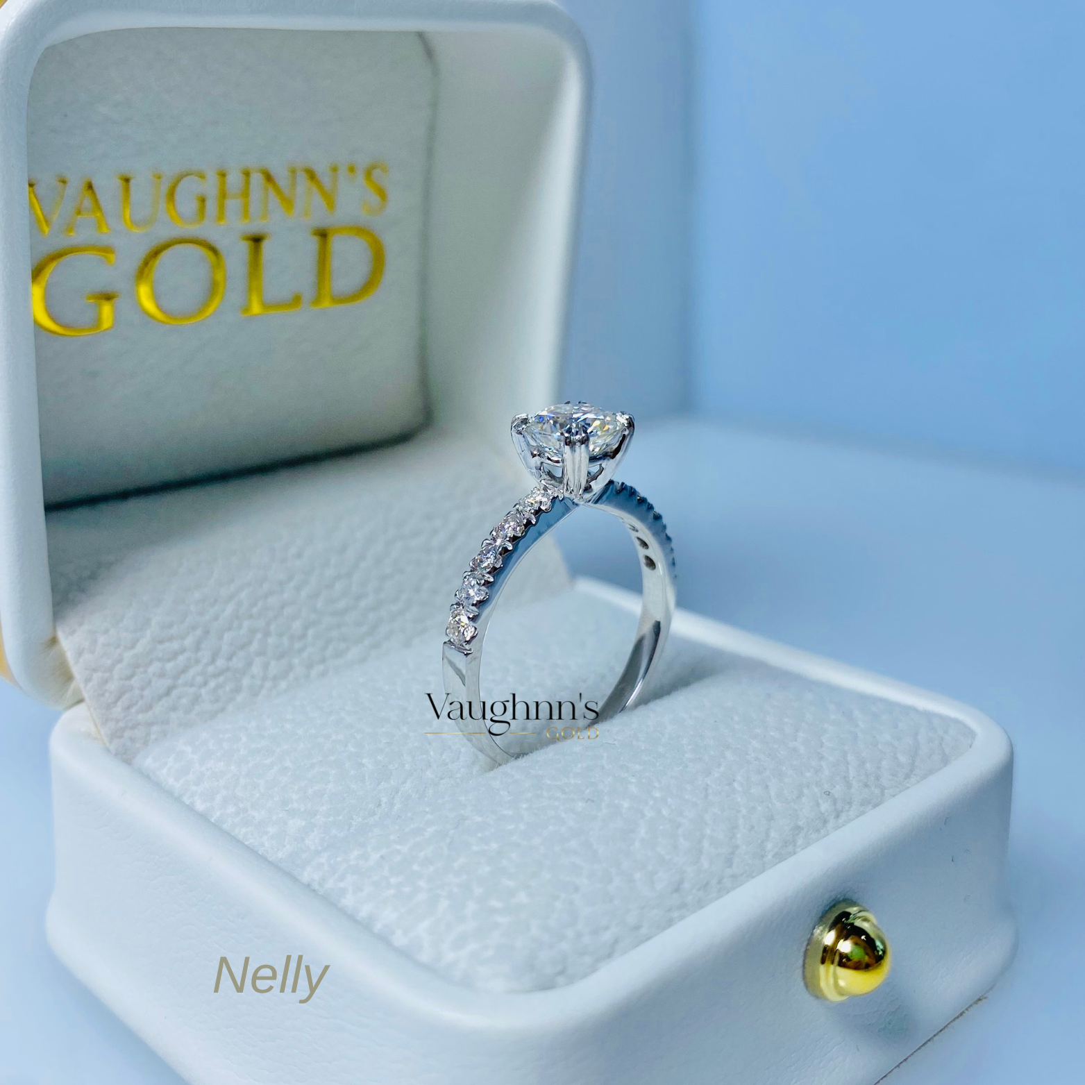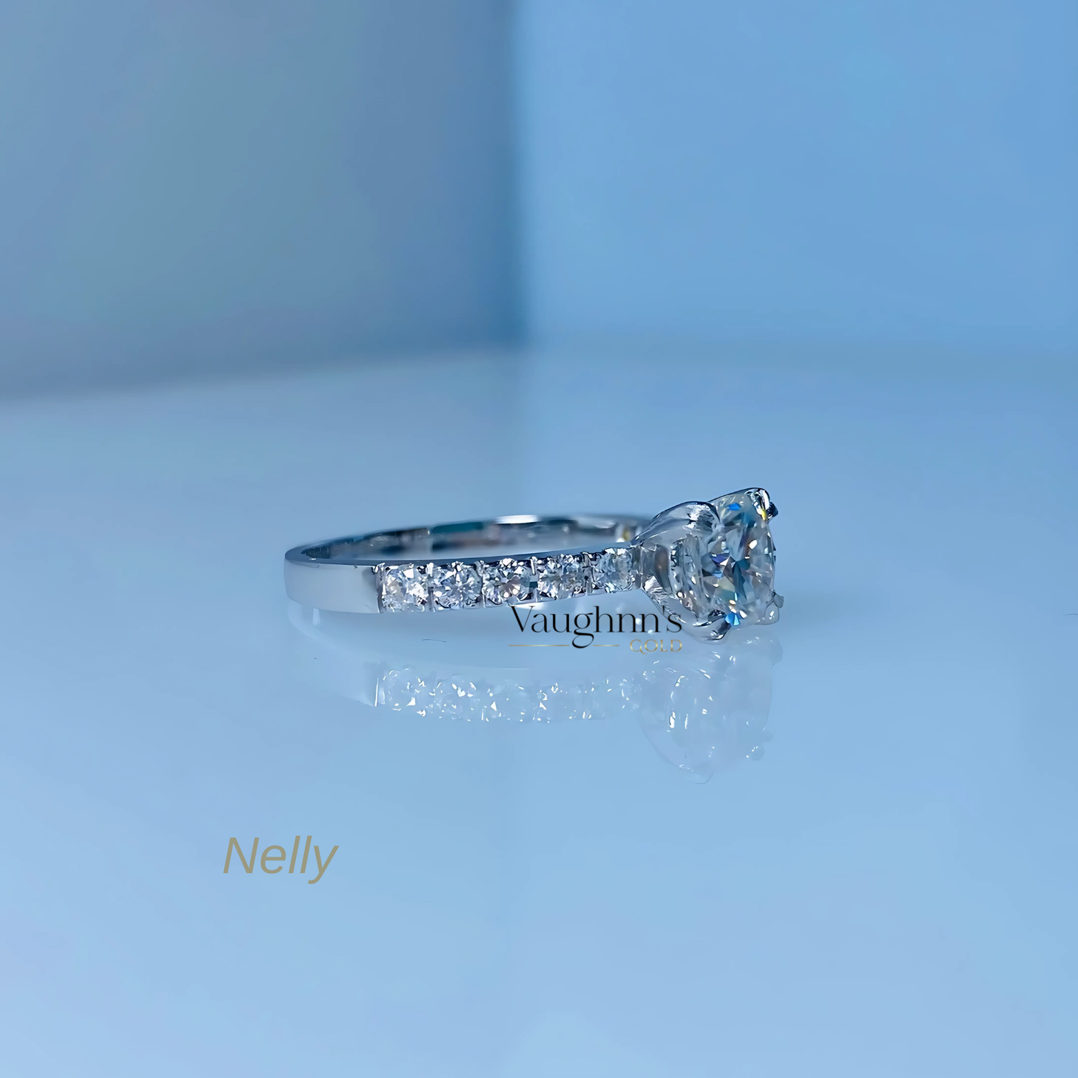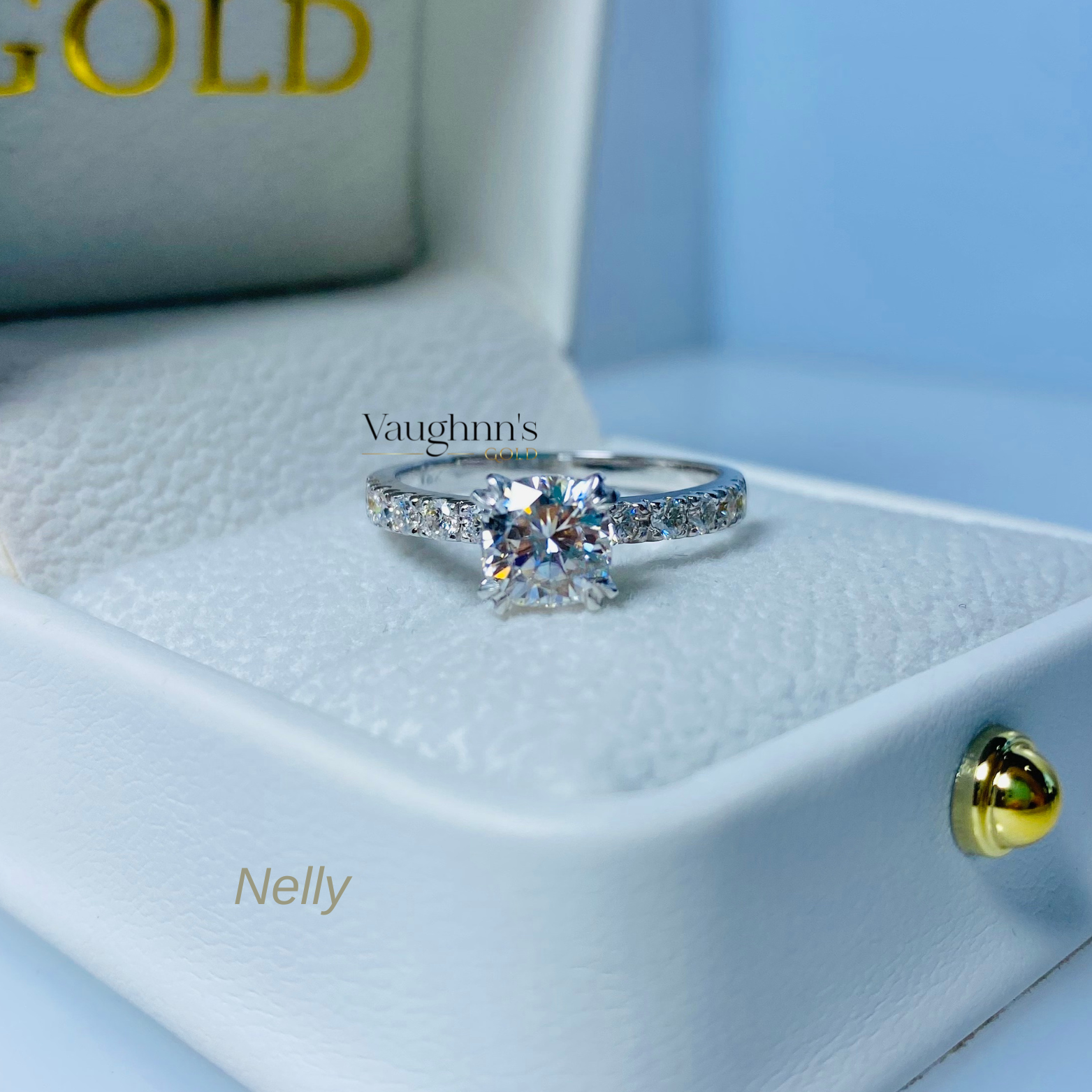Designed to captivate, the Nelly ring features a 1-carat cushion-cut moissanite set in solid 18k white gold. The center stone is secured by four distinctive double-style prongs, adding a unique and elegant touch to a classic silhouette. A French pavé band adorned with shimmering moissanite stones enhances the brilliance from every angle.