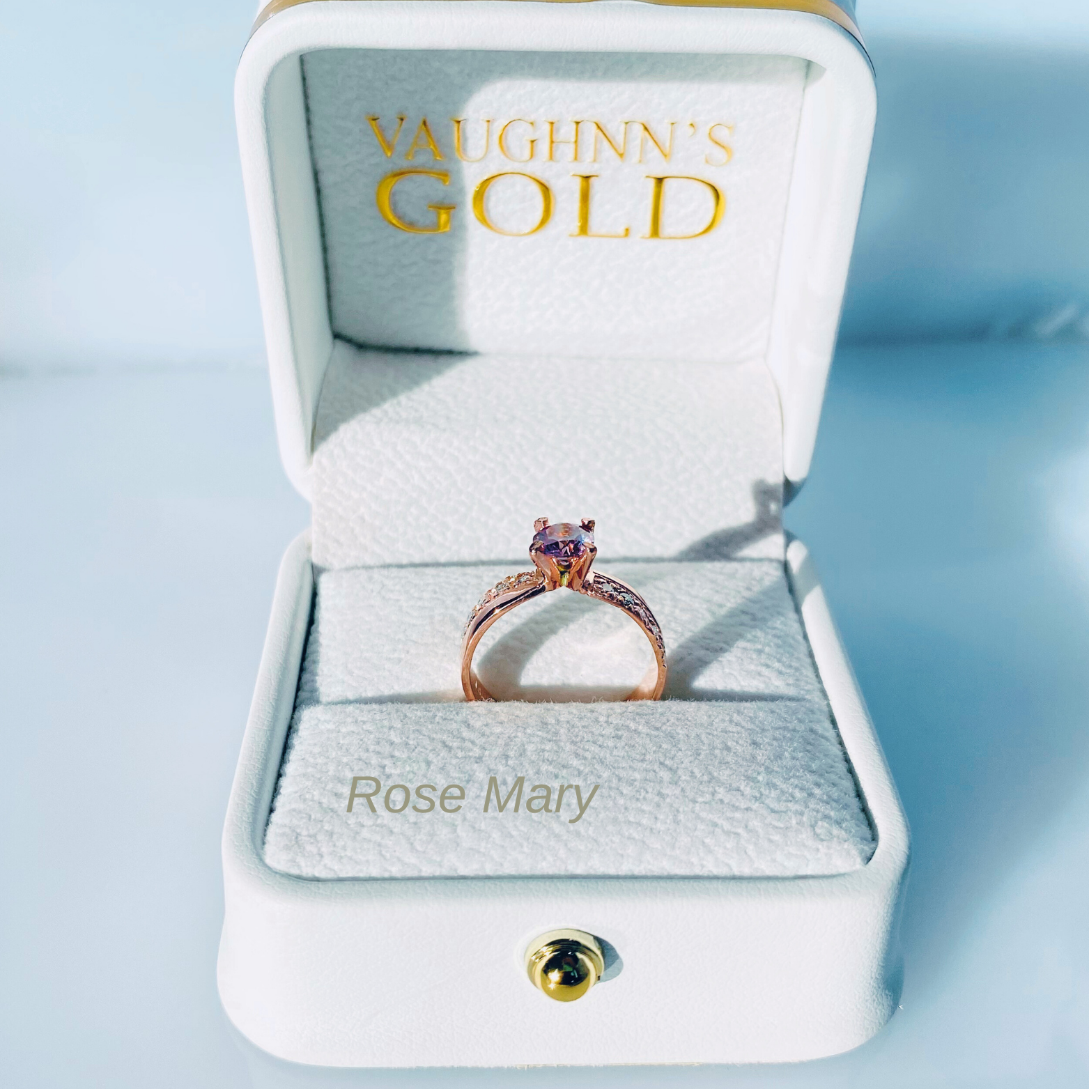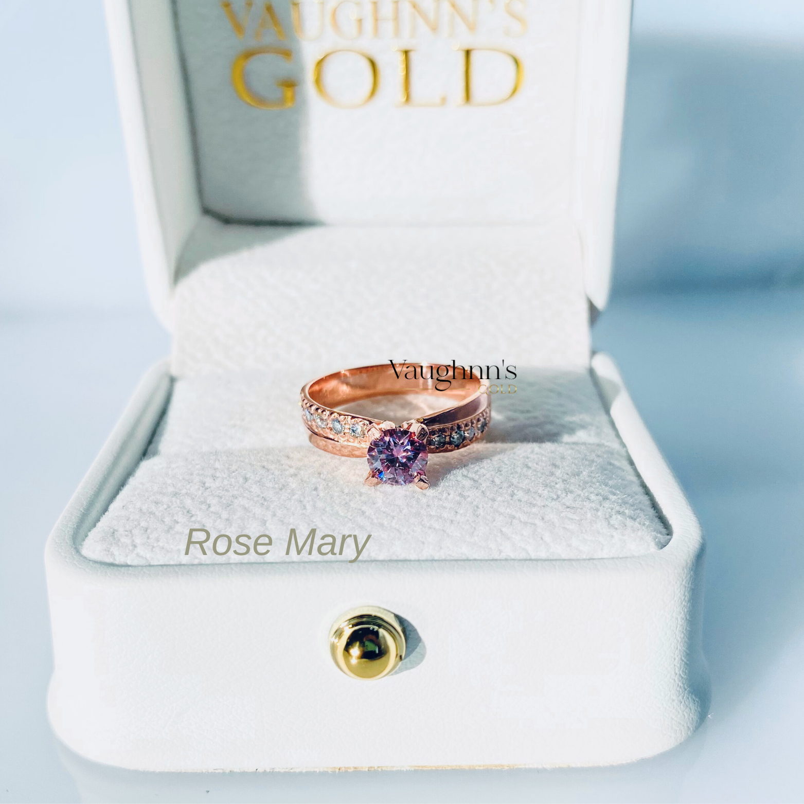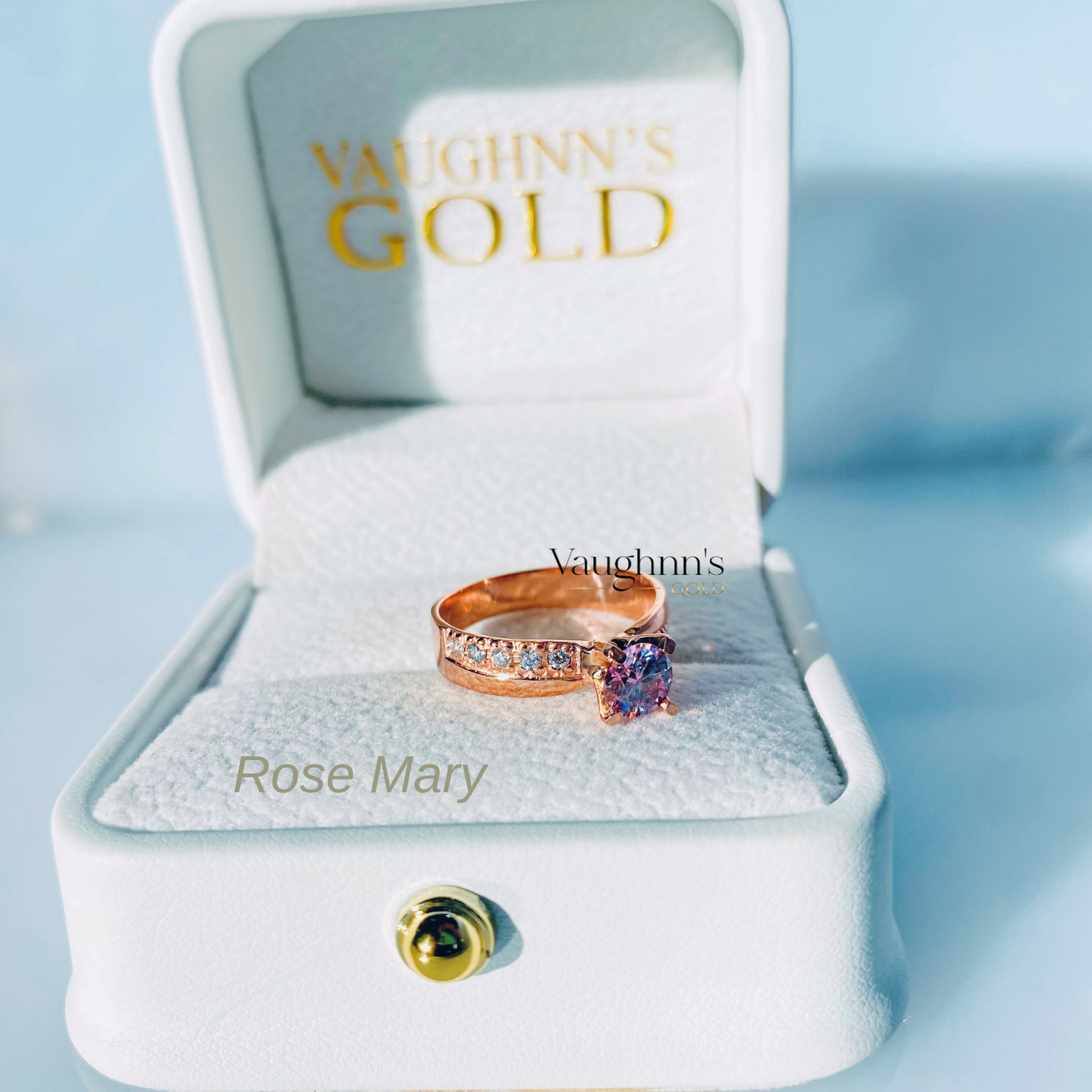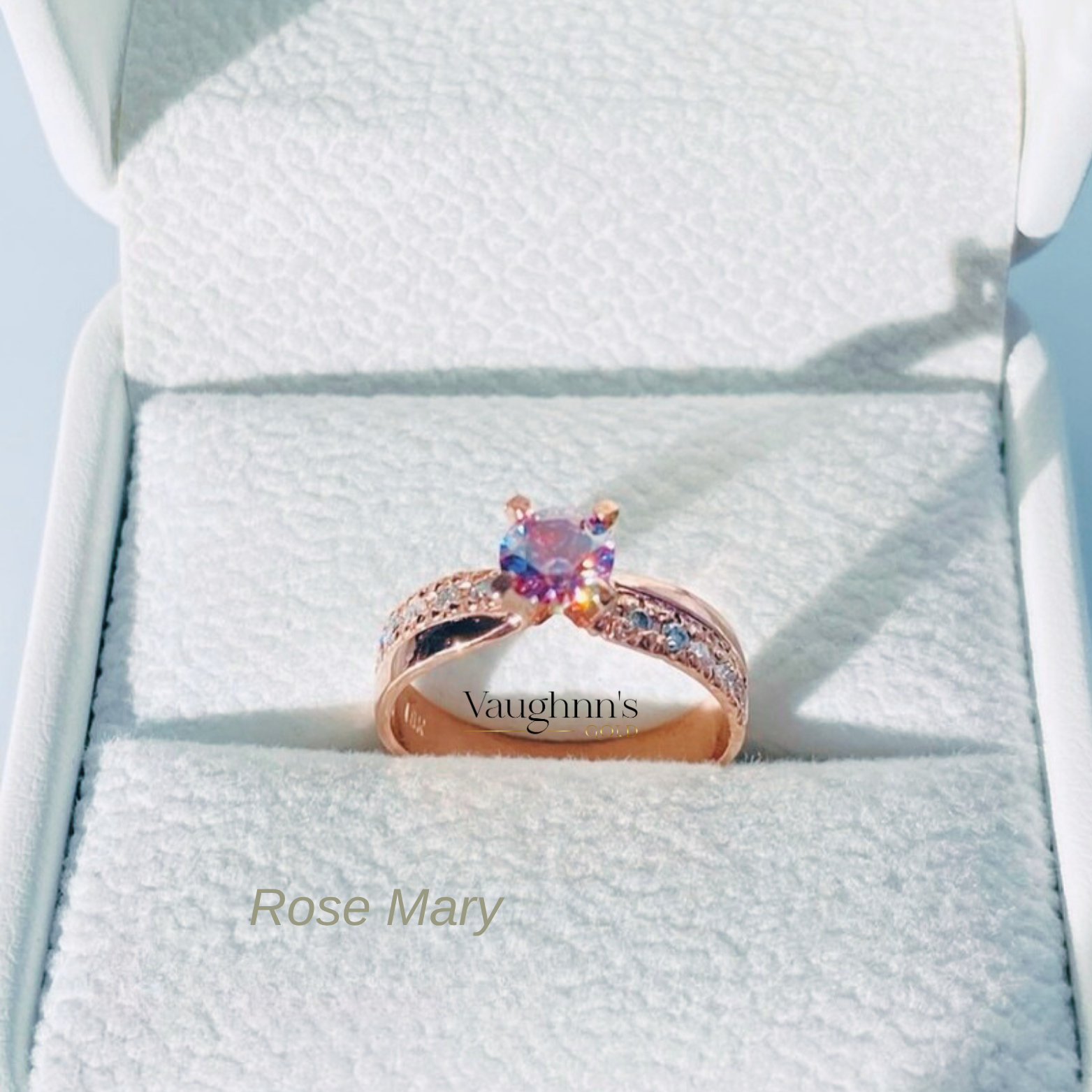 The Rose Mary engagement ring showcases a stunning 1-carat pink moissanite set in warm 18k solid rose gold. Accented with 0.02ct diamonds on each side, this ring combines delicate sparkle with a romantic hue. Its elegant and distinctive design makes it the perfect choice for expressing your unique love story with timeless beauty and charm.