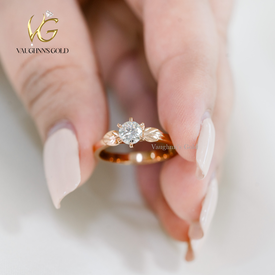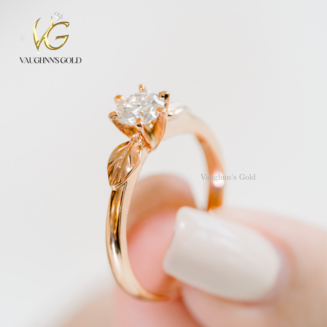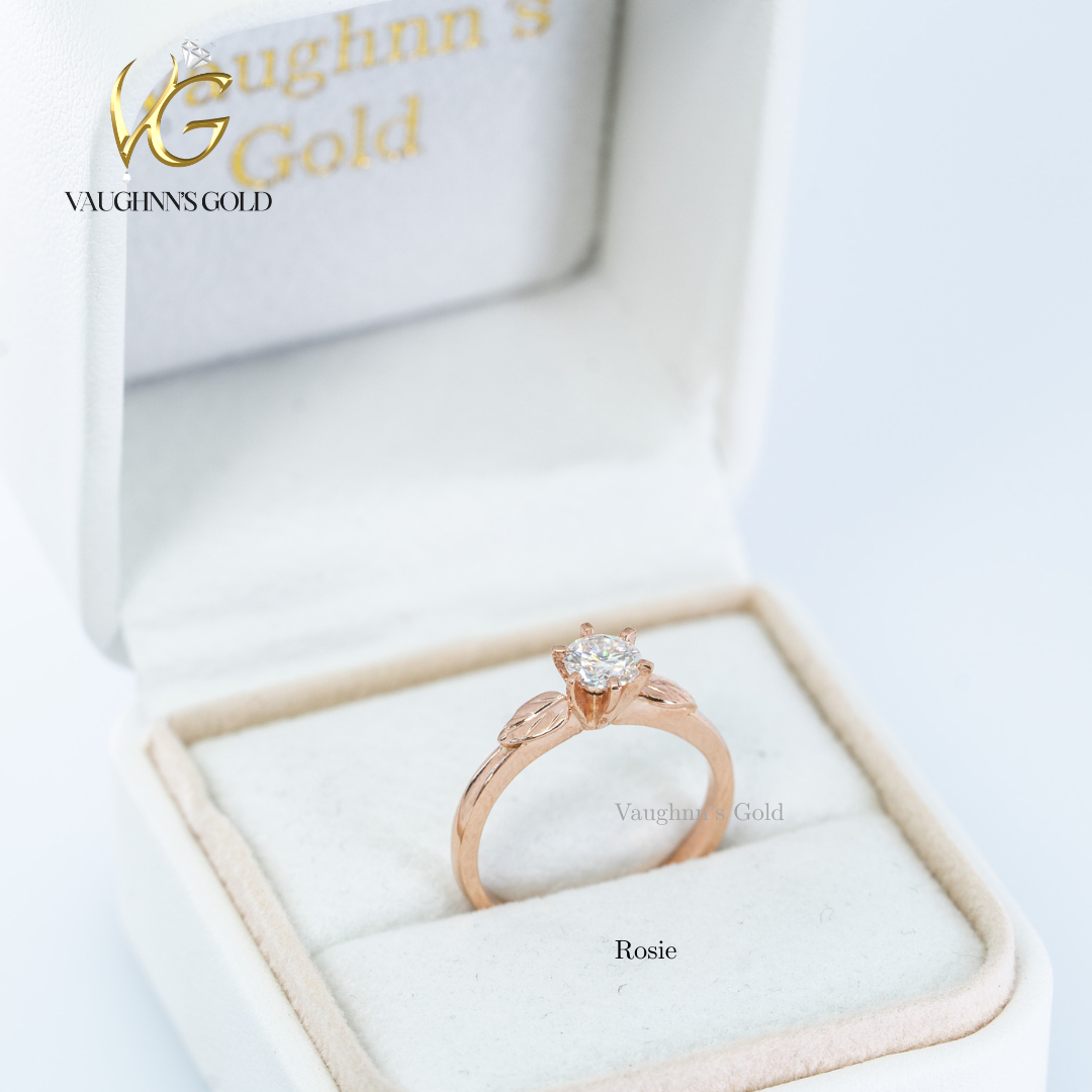 Rosie is beautifully crafted in 18K Rose Gold, featuring a sparkling 0.30 ct diamond at the center. The design is enhanced with delicate leaf details on the sides, giving it a soft, romantic, and nature-inspired touch.